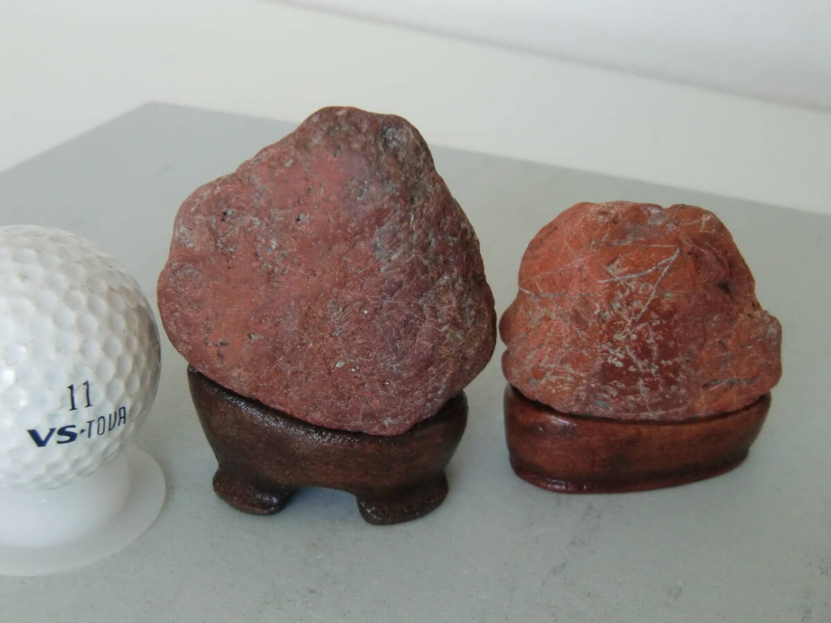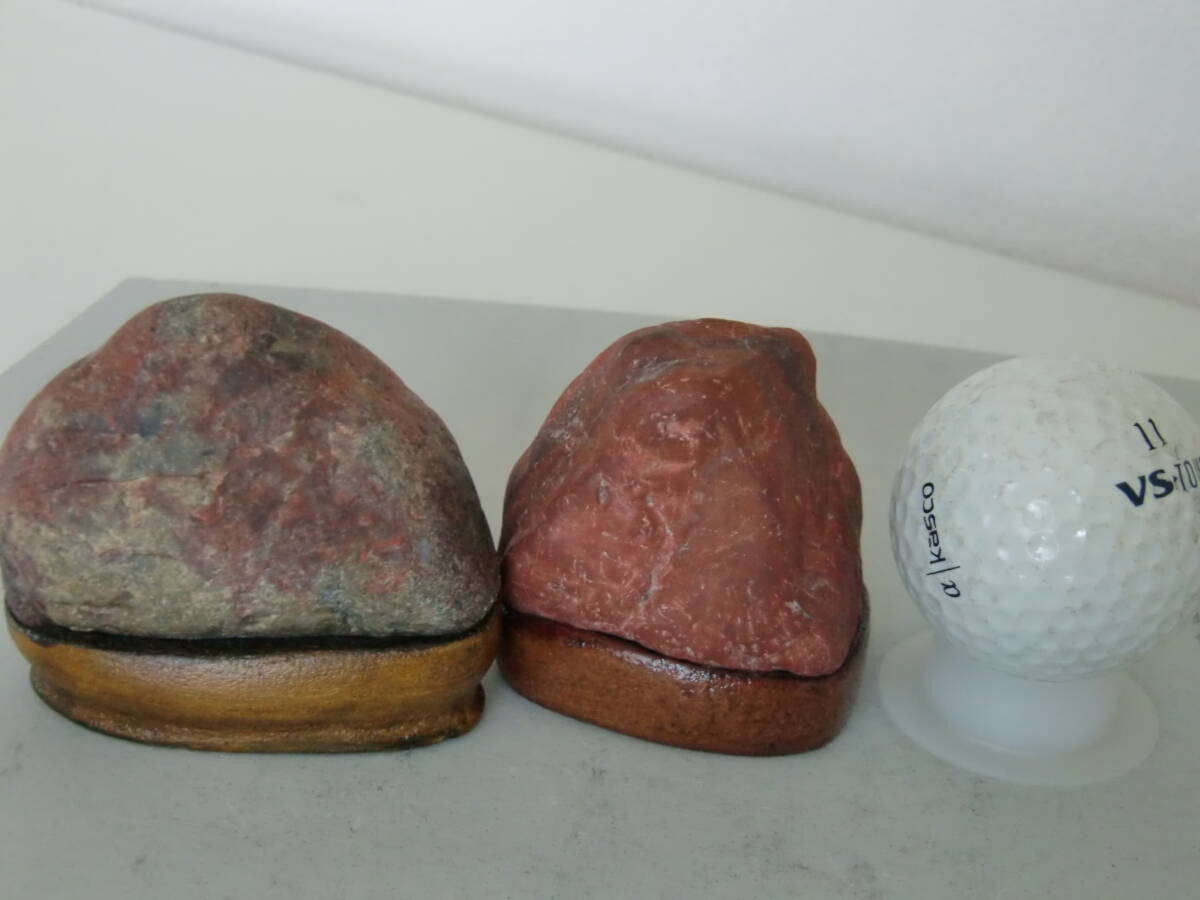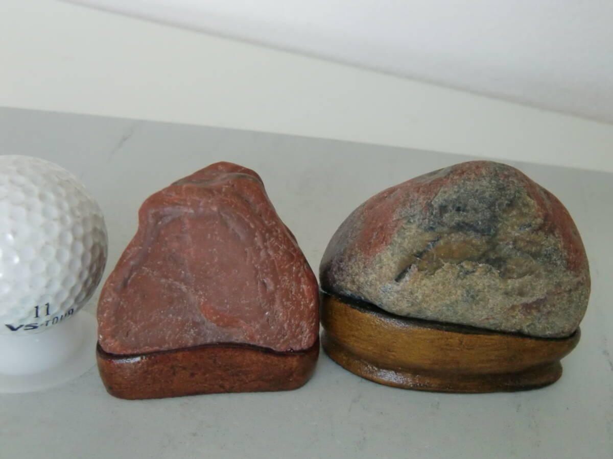 ①大きさは写し込みのゴルフボールを参考にしてください、重さは5ケで550gです、台座は木粉粘土です。