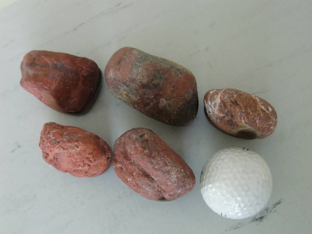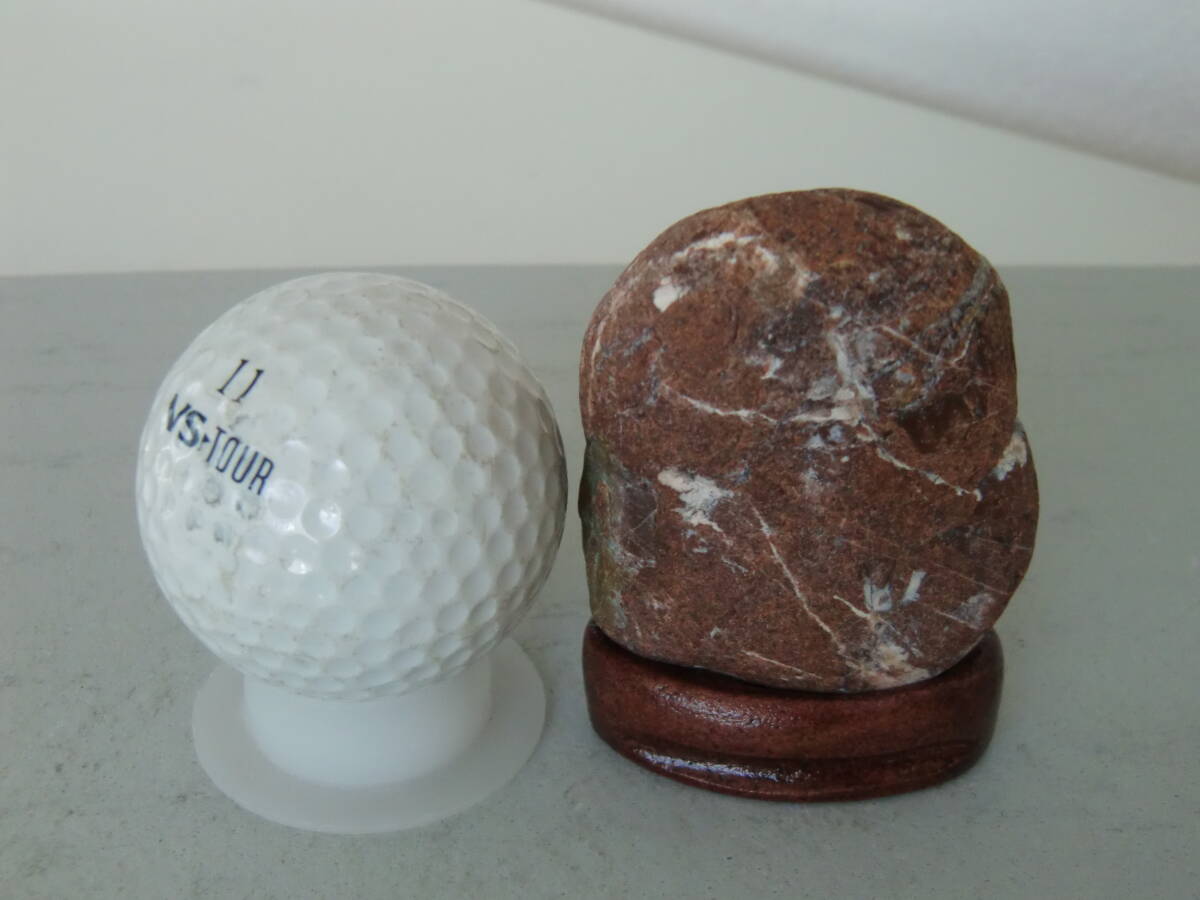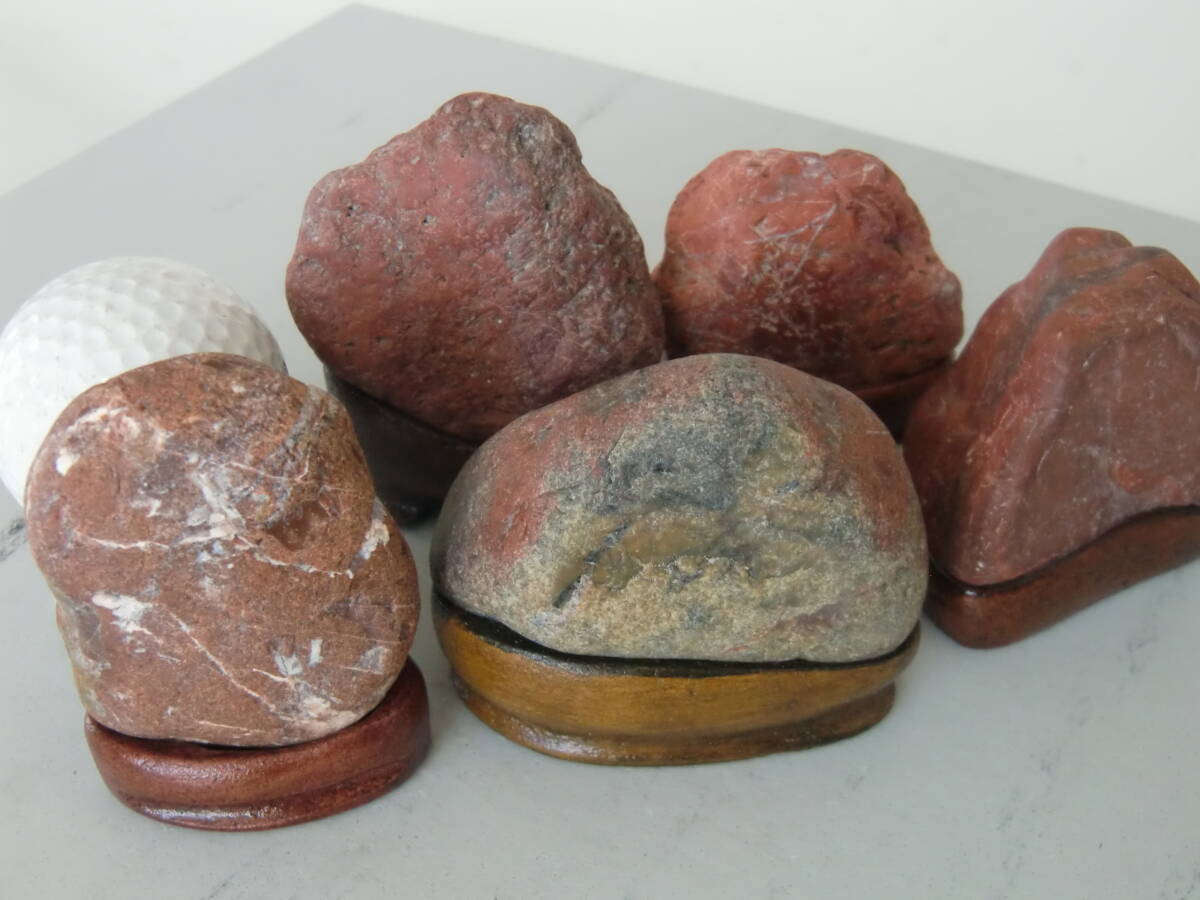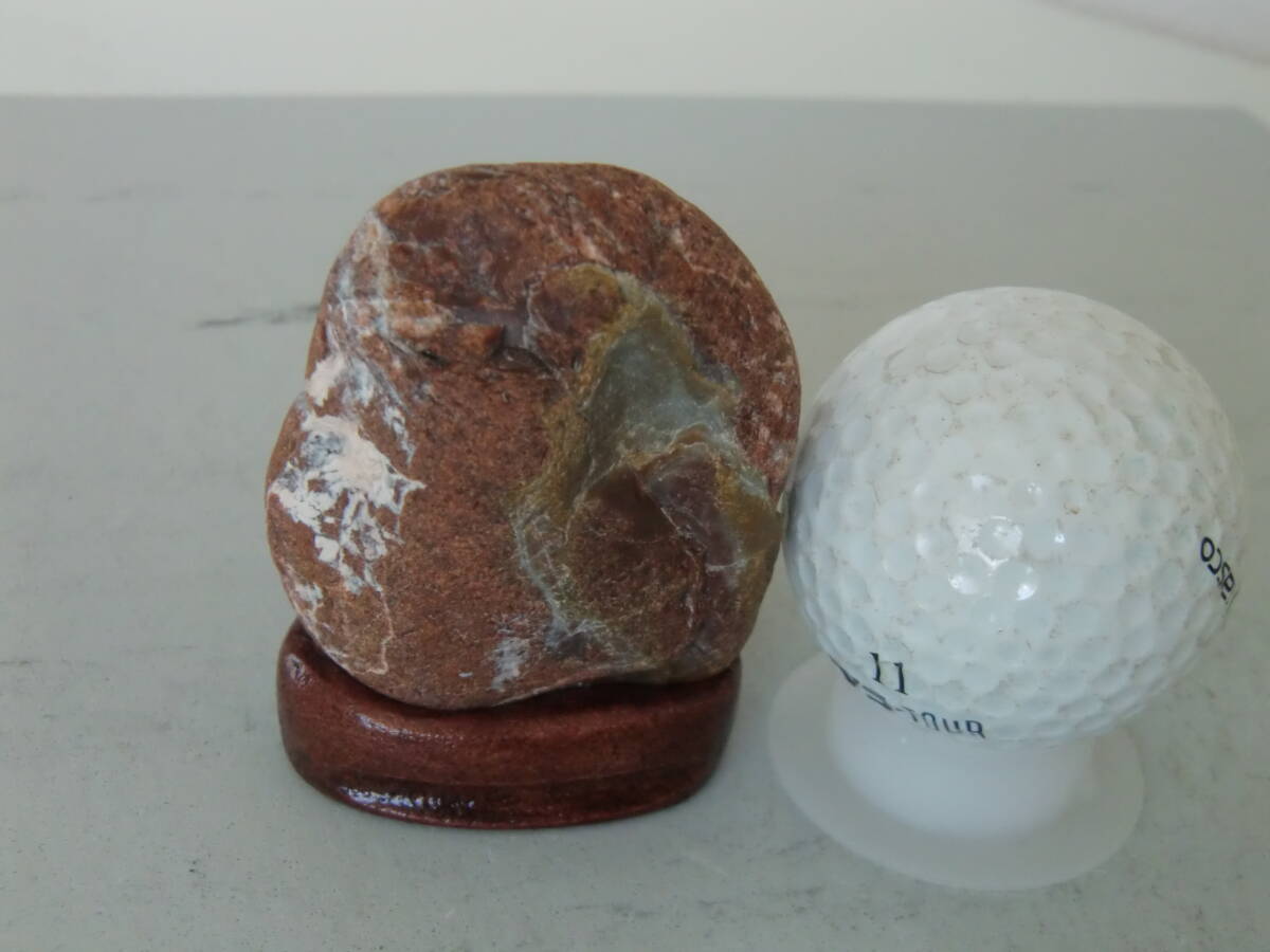 ①大きさは写し込みのゴルフボールを参考にしてください、重さは5ケで550gです、台座は木粉粘土です。