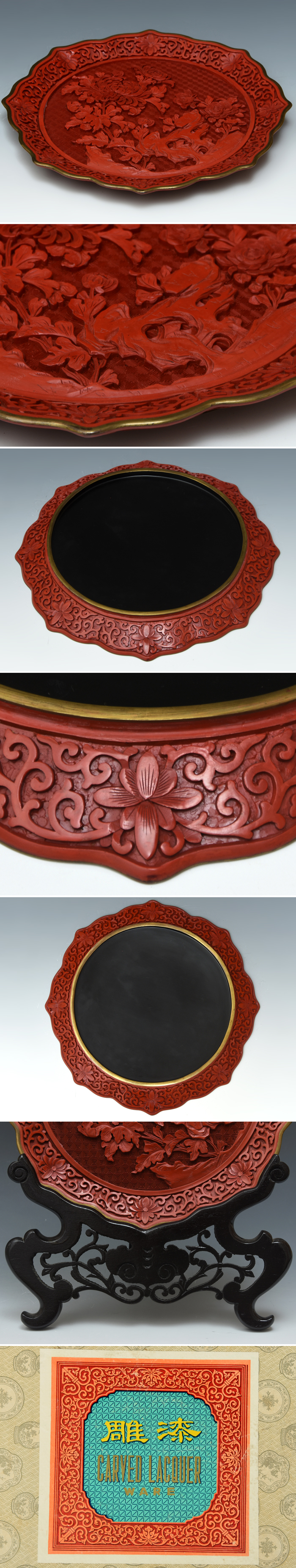 | 中国美術 時代 堆朱菊牡丹彫輪花形大皿 透かし木製台座 飾皿 盆 細密彫 唐物 中国古玩 金属工芸 漆工芸 漆芸 陶胎漆器 |