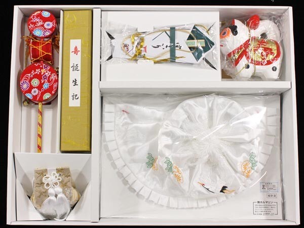 大黒帽子(刺繍入り)・よだれ掛け(刺繍入り)・お守り・扇子・犬張り子・でんでん太鼓・誕生記
