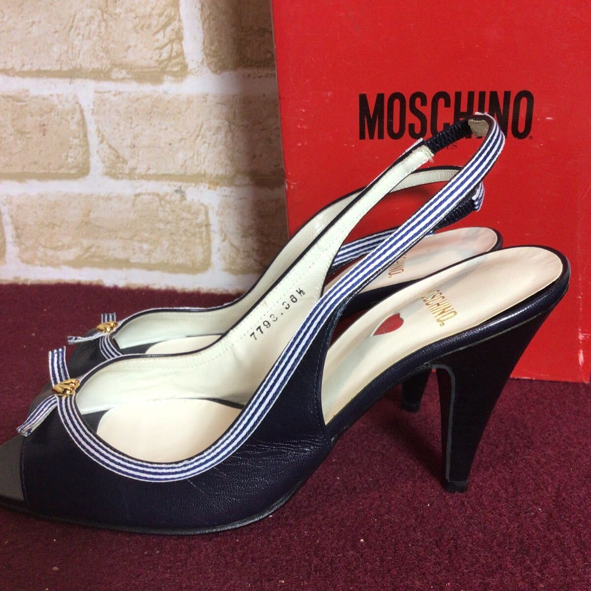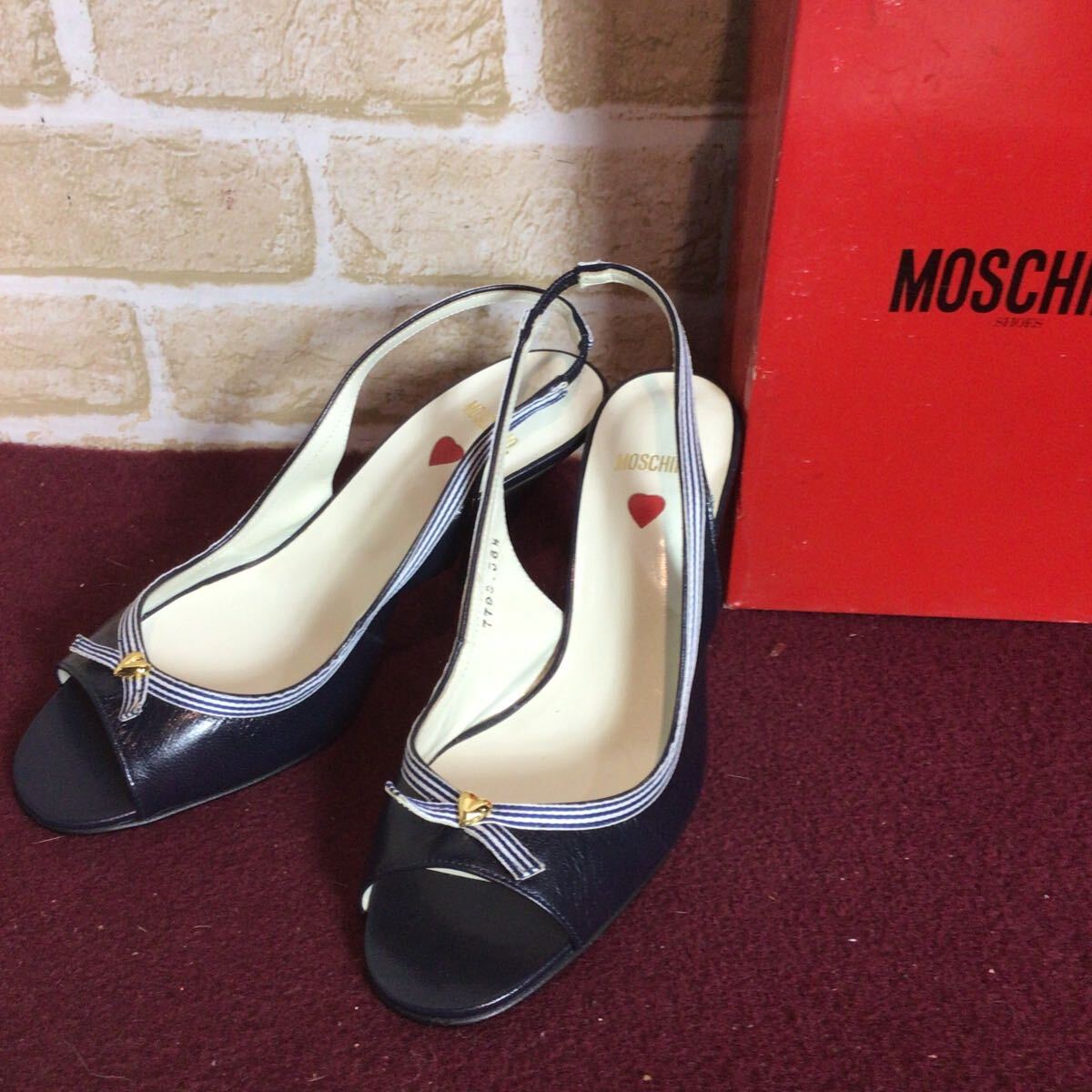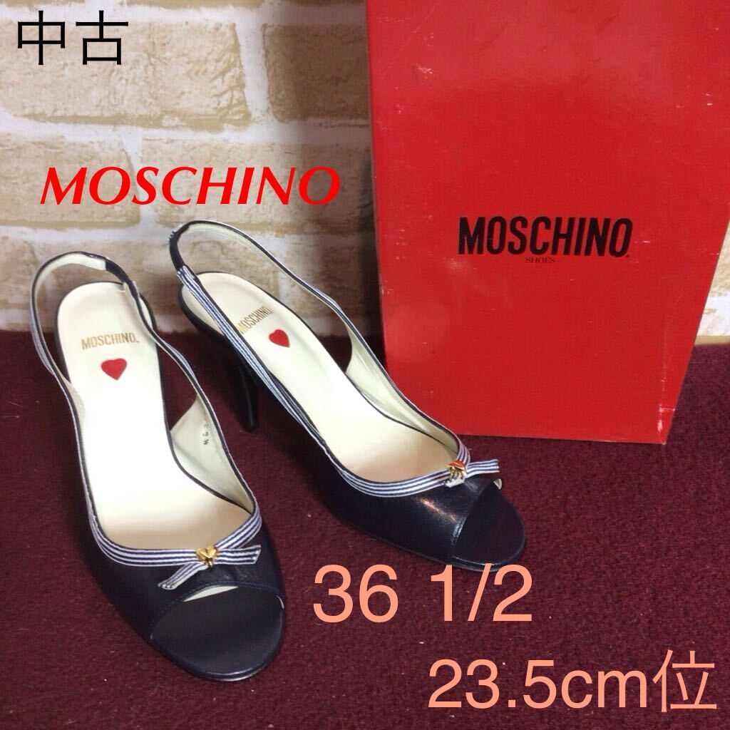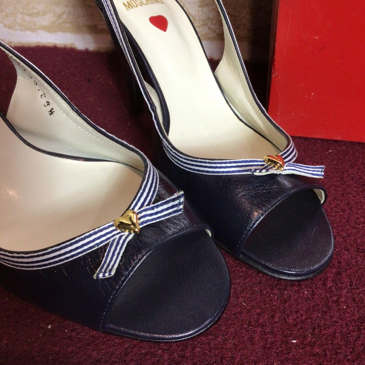 【売り切り!送料無料!】A-367 MOSCHINO!レザーサンダル!紺色!36 1/2 23.5cm!ハート!ボーダー!おしゃれ!かわいい!天然皮革!日本製!中古!