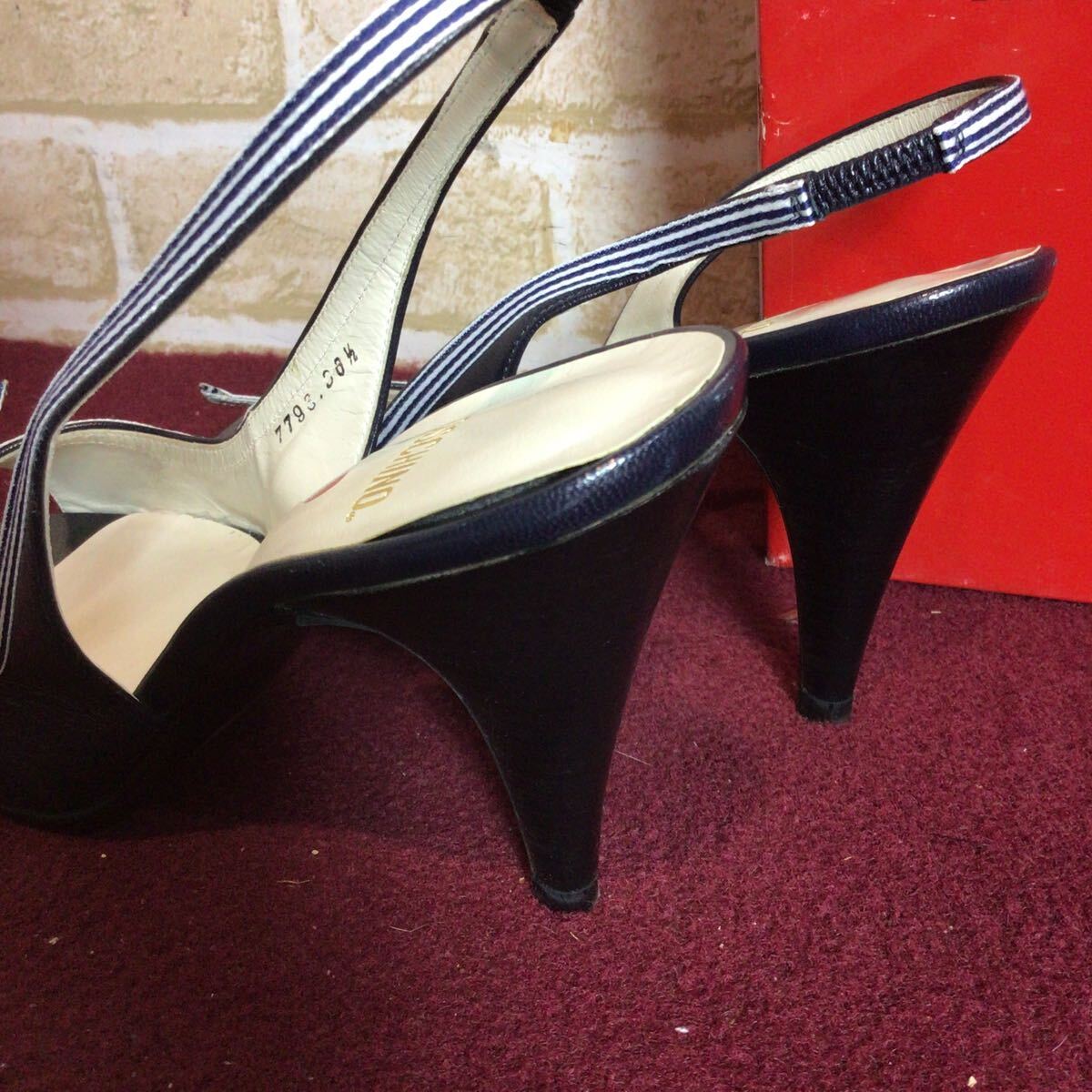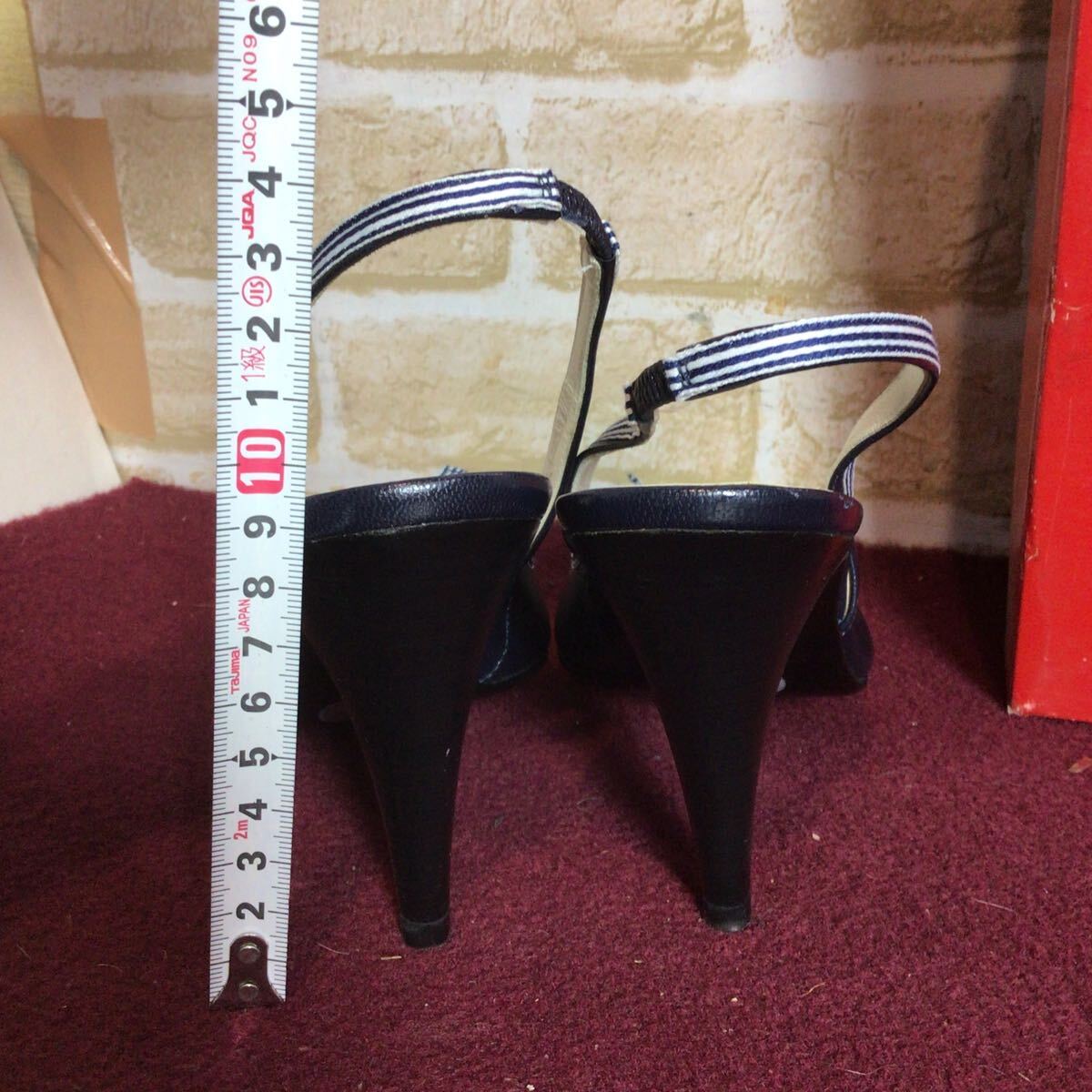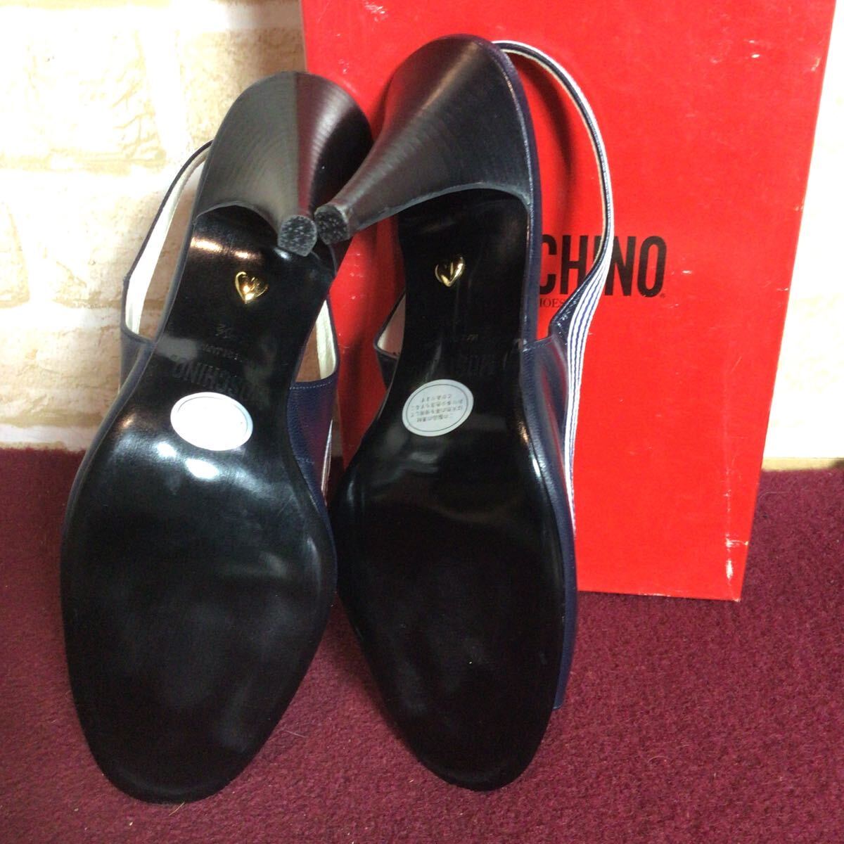 【売り切り!送料無料!】A-367 MOSCHINO!レザーサンダル!紺色!36 1/2 23.5cm!ハート!ボーダー!おしゃれ!かわいい!天然皮革!日本製!中古!