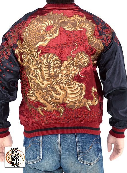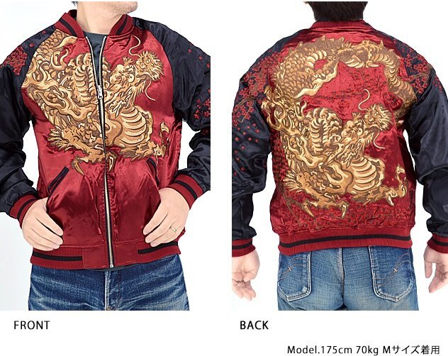 絡繰魂さんから「粋 古の龍桜リバーシブルスカジャン(242056)」のご紹介です。 重みを感じる程の刺繍量が魅力的な絡繰魂から、最新作のスカジャンが登場しました。 今回モチーフの主役に採用されたのは、迫力満点の「龍」柄。 背中には巨大な龍が乱舞する姿をダイナミックに落とし込みました。 表面はしっかり柄の入ったスカジャンですが、対象的に裏面はシンプルに仕上げ、メリハリを付けました。 ボディーにはレーヨンサテンを使用し、ドレープや陰影がくっきりと現れています。 | ||||||||||||||||||||
