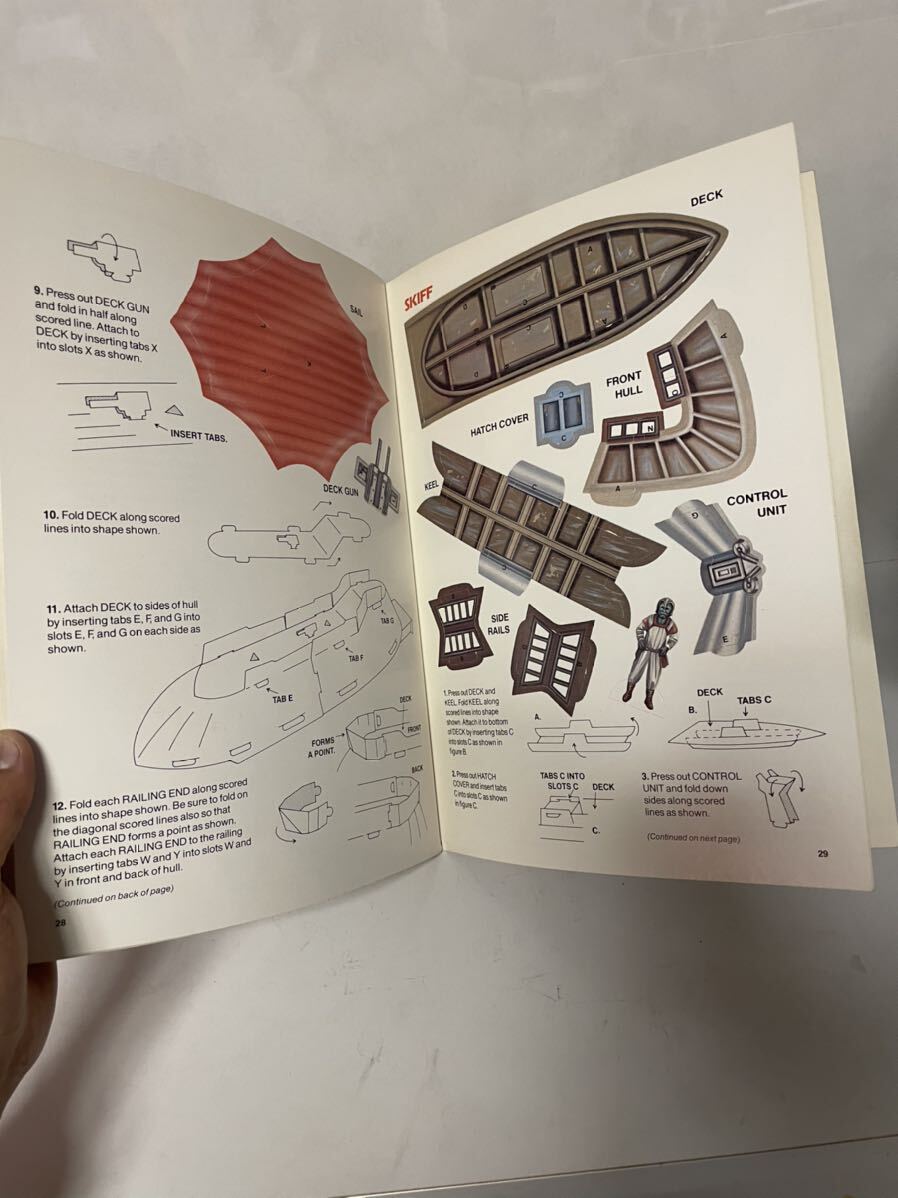 映画劇中に登場する人気ビークルを紙工作で再現できるユニークな書籍で、特に ジャバのセイルバージやスキッフ関連のアイテムはコレクター人気が非常に高い です。