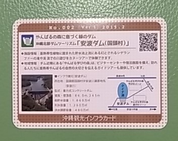 沖縄県のインフラカード、安波ダム。№002 (Ver.1)2015,2 です。保護ラップに入れ厚紙で保護してミニレターで発送します。送料85円。カードは4枚まで同梱できます。不明な点はご質問ください。