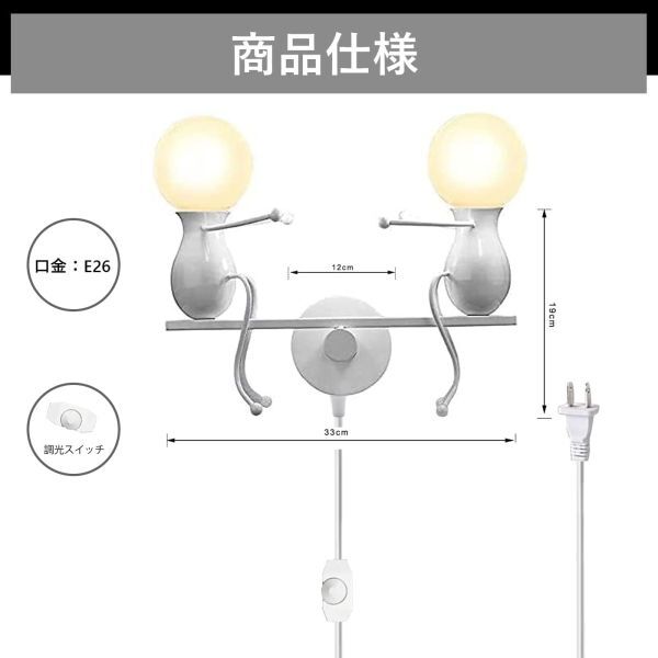 • 【商品仕様】12cm×19cm×33cm(詳細は仕様図ご参考してください)。素材:鉄製。入力電圧:AC110V〜240V。材質:鉄製。口金:E26(Max60W、電球別売り)。色:ホワイト。コード長さ:170cm。取付方法:壁掛けフックで固定+コンセント式。点灯:調光スイッチ。※LED電球非対応。コンセント式、そのまま壁に打ち込むだけなので取り付けて、取り外しが簡単です。石膏ボードやベニヤ板・レンガなどの壁にお使いいただけます。※ご注意:電球をあまりきつ過ぎしないように、取り付けてください。※電球付属しておりません。