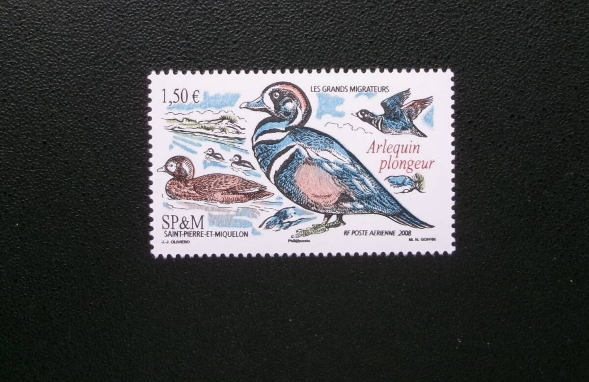 サンピエール島・ミクロン島2008年発行 渡り鳥・オスとメスのシノリガモ・航空郵便用切手 1種完 NH 凹版印刷 未使用美品です。