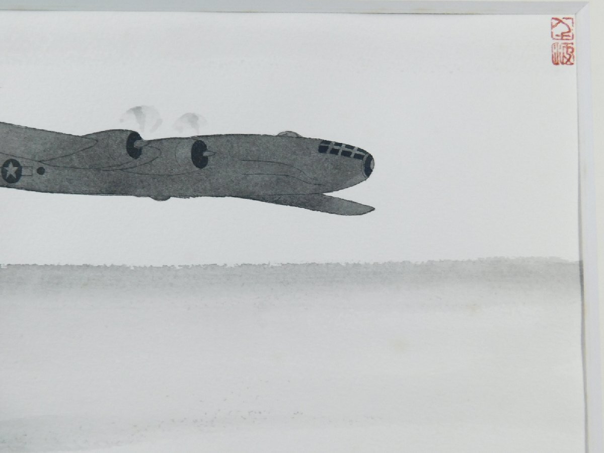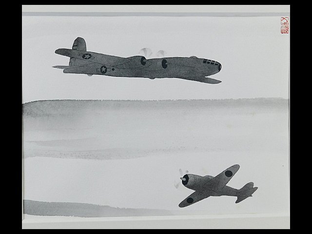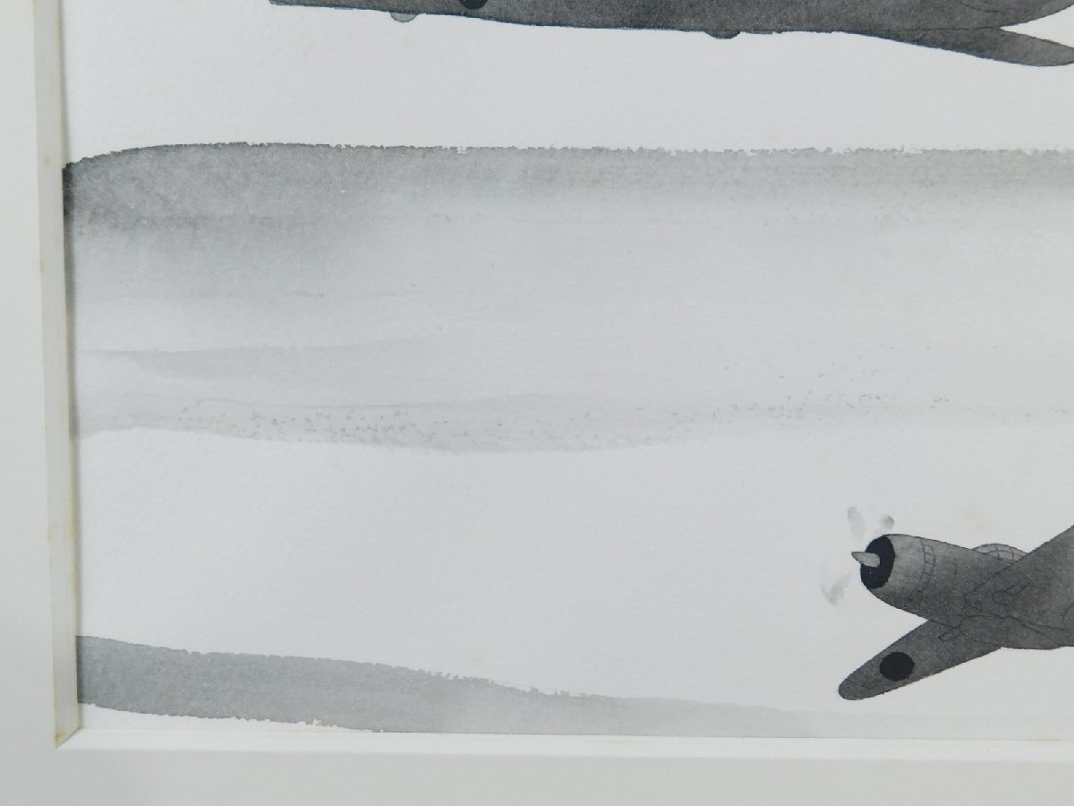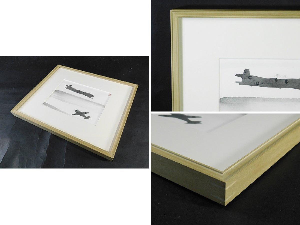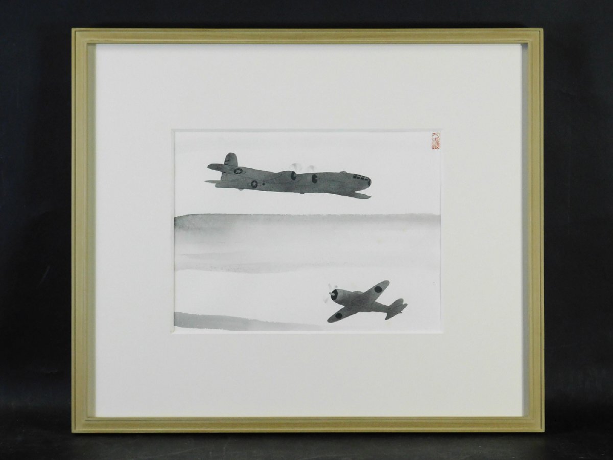 中島千波 戦闘機(零戦 B29)日本画 水墨画 挿絵 肉筆 額装 専用タトウ 共シール OK5081