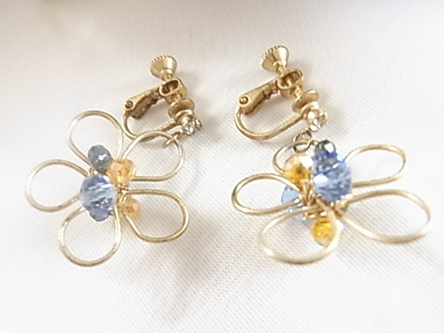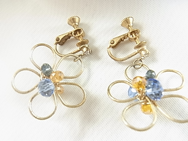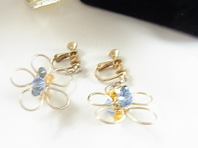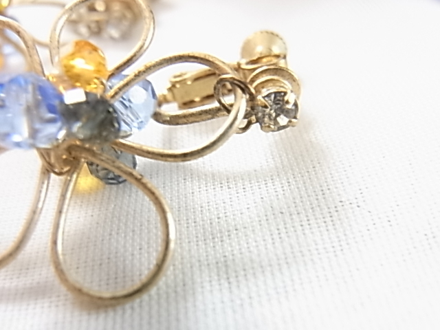 ビンテージ/ヴィンテージ 小さなクリアラインストーン付き 輝くビジュー 3色のビーズストーン煌く お花デザイン 軽量 イヤリング▽