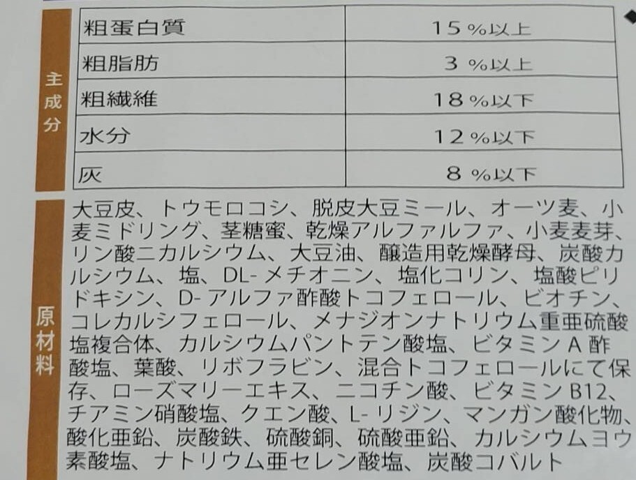 【主成分】 ・粗蛋白質15%以上・粗脂肪3%以上・粗繊質18%以下・水分12%以下・灰8%以下 【原材料】 ・大豆皮・トウモロコシ・脱皮大豆ミール・オーツ麦・小麦ミドリング・茎糖蜜・乾燥アルファルファ・小麦麦芽・リン酸-水素カルシウム・大豆油・醸造用乾燥酵母・炭酸カルシウム・塩・DL-メチオニン・塩化コリン・塩酸ピリドキシン・D-アルファ酢酸トコフェロール・ビオチン・コレカルシフェロール・メナジオンナトリウム重亜硫酸塩複合体・カルシウムパントテン酸塩・ビタミンA酢酸塩・葉酸・リボフラビン・ローズマリーエキス・ニコチン酸・ビタミンB12・チアミン硝酸塩・クエン酸・L-リジン・マンガン酸化物・酸化亜鉛・炭酸鉄・硫酸銅・硫酸亜鉛・カルシウムヨウ素酸塩・ナトリウム亜セレン酸塩・炭酸コバルト