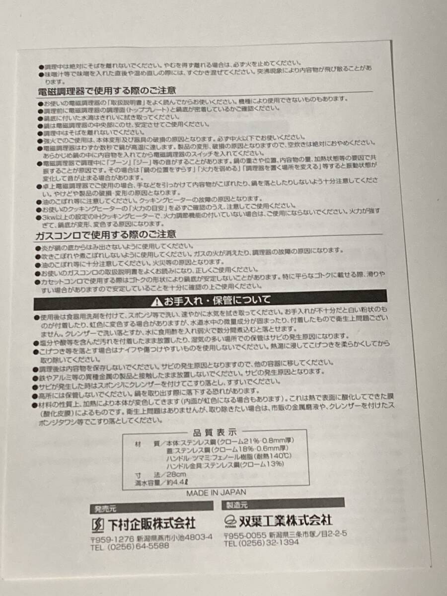 【日本製】【未使用】【新品】IH対応 浅型実用鍋 28cm 双葉工業 両手鍋