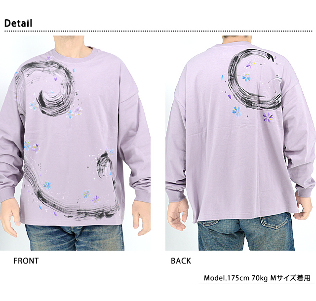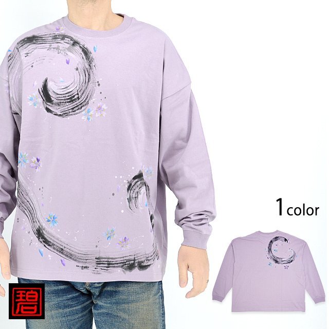 この道40年以上の「ぬれ描き友禅作家・碧三」が魅せる上品で繊細さが特徴の碧(あお)より「風に紫青花ビッグシルエット長袖Tシャツ」のご紹介です。 水墨画のようなタッチが魅力的な、味わい深い長袖Tシャツです。 フロント、バックともに、風の流れを筆で表現。 周囲には紫と青の小花を散らし、上品なデザインに仕上げました。 ボディーには、綿100%のさらりとした肌触りのTシャツ生地を採用。 襟元、袖口にはリブを配しました。 | ||||||||||||||||||||