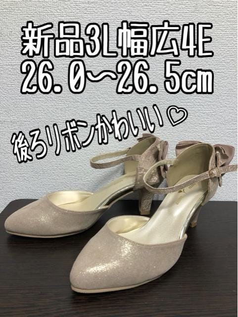 新品☆3L26~26.5幅広4E♪後ろリボンかわいいパンプス♪結婚式・パーティ☆b464
