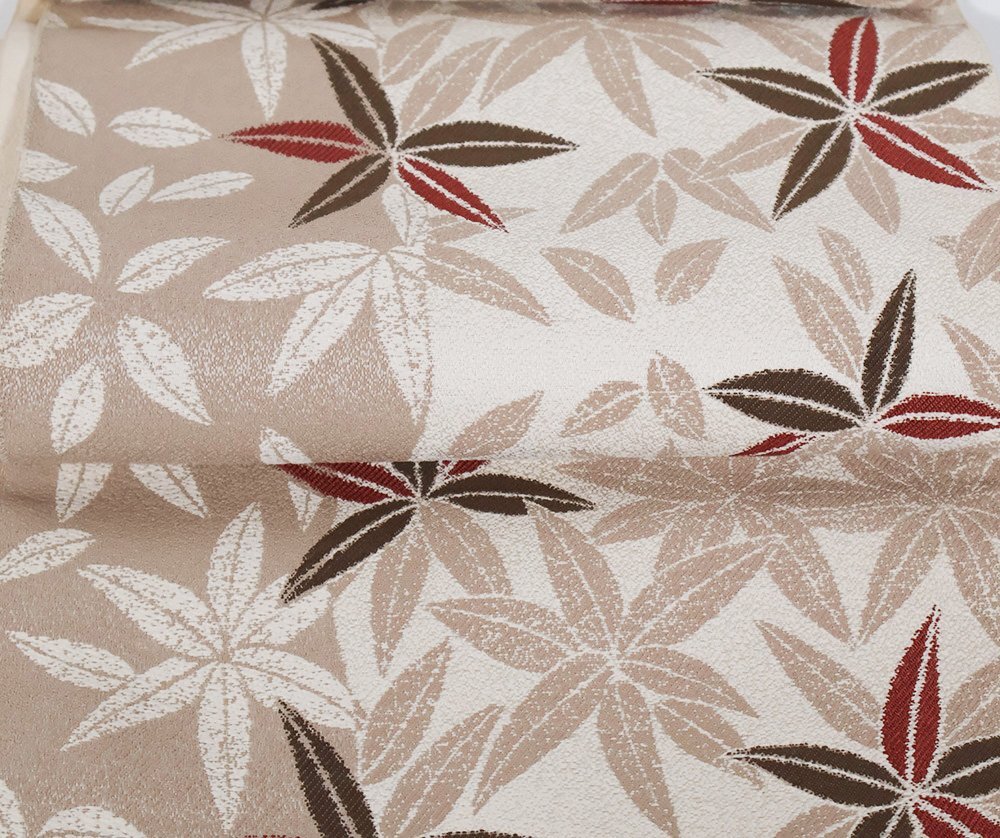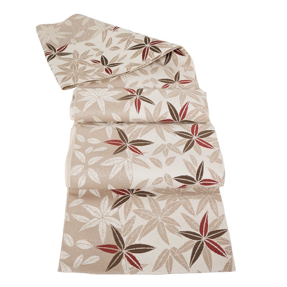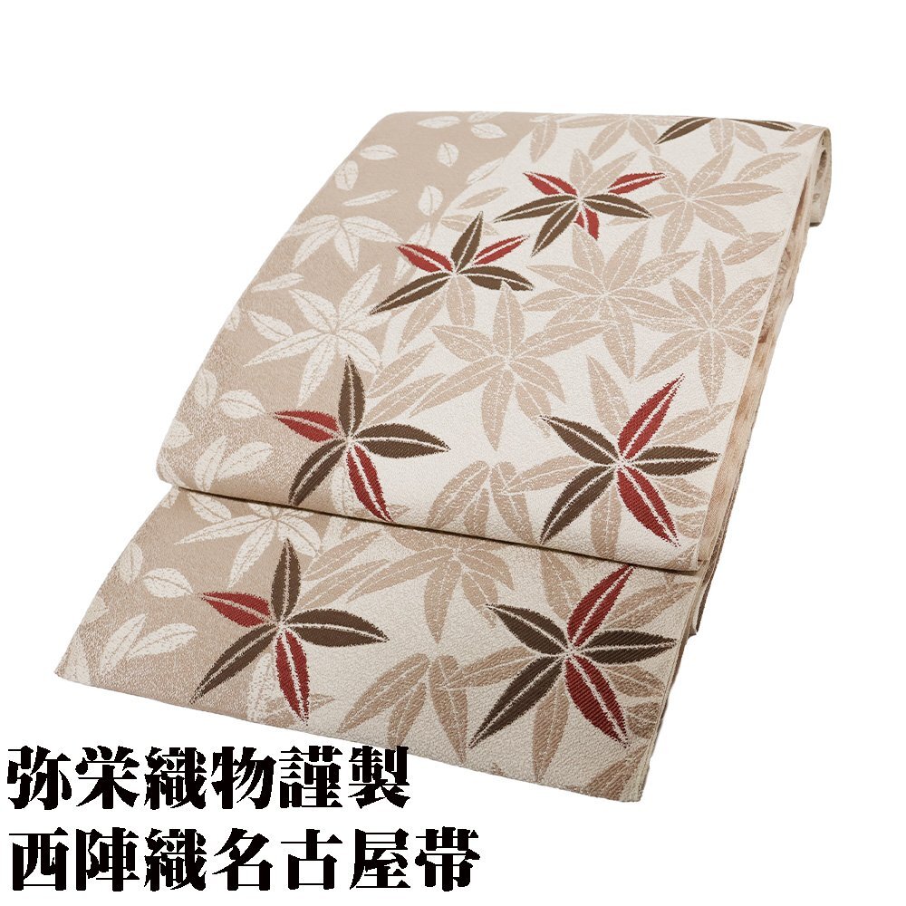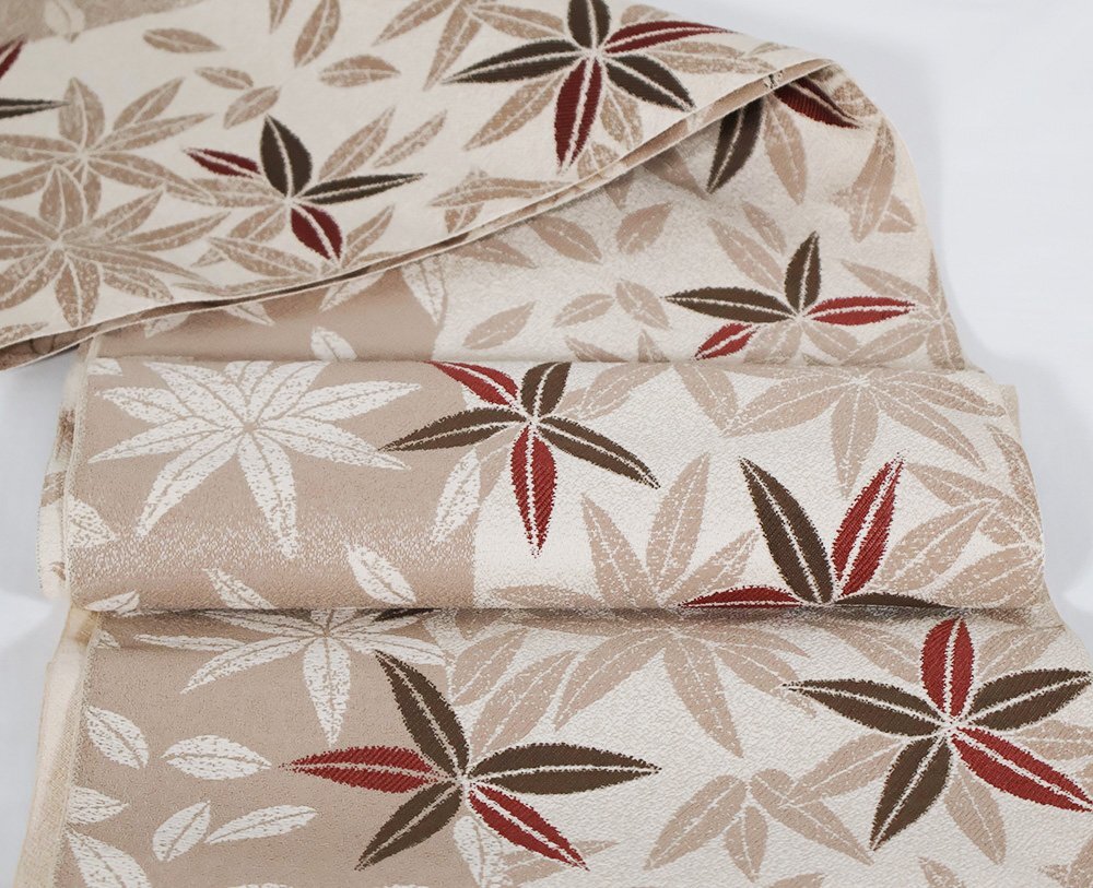 | 弥栄織物謹製 西陣織 八寸名古屋帯 ベージュ・小豆色・赤紫・抹茶色地 葉柄 新品 仕立て上がり 日本製 | |
