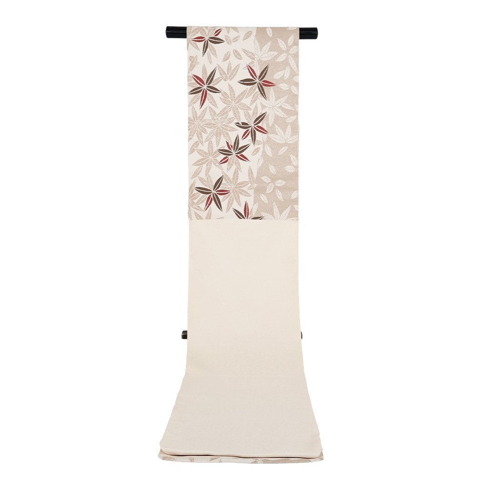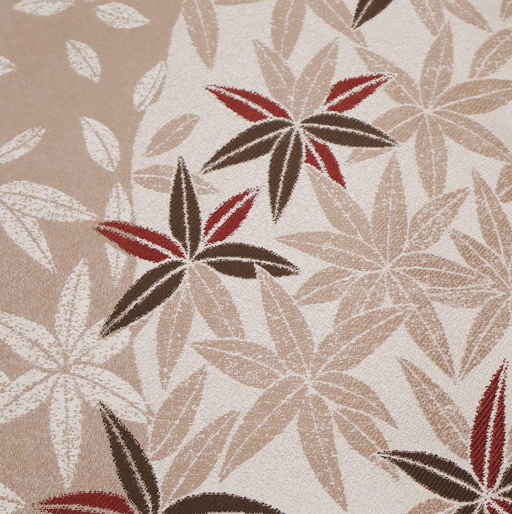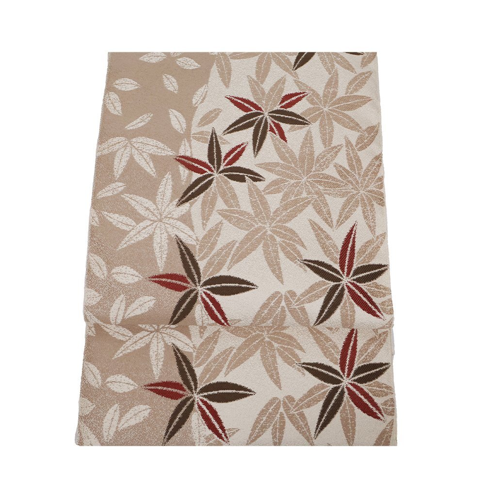 | 弥栄織物謹製 西陣織 八寸名古屋帯 ベージュ・小豆色・赤紫・抹茶色地 葉柄 新品 仕立て上がり 日本製 | |