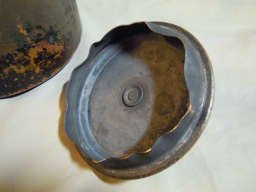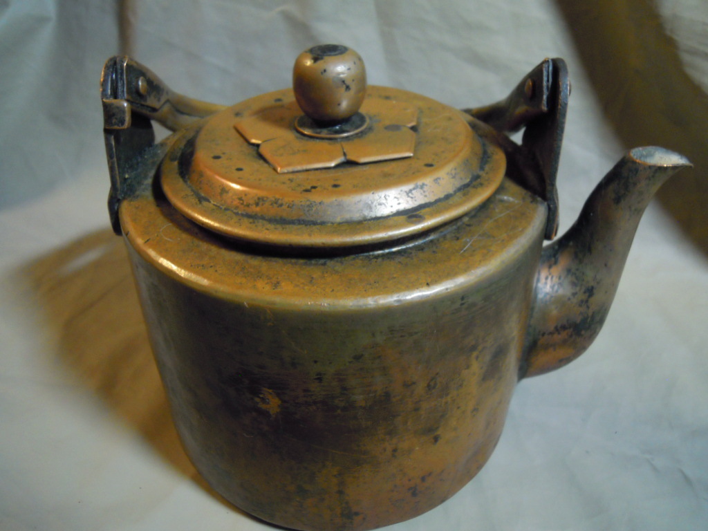 使い込まれた銅製のヤカン。重さ1.3kg。厚い造りでとてもしっかりしています。内部は湯垢が付いていますが敢えて手入れせずそのままの状態としています。胴の直径は15.5センチ。