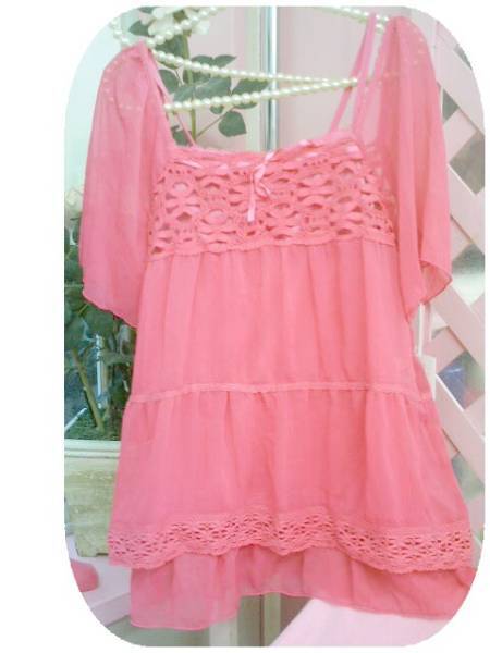 胸元かぎ編みお花柄レースでとても可愛くサテンピンクリボン付きでお袖フレアーで胸下2段切り替えありでレース付きで裾かぎ編みレースでフレアーでとても素敵なシフォン透かしトップスになります。インナーはバックシャーリング入りで胸元レース付きで裾シフォンフリル付きでとても姫カワでセットで着ていただけると胸元レースと裾のフリルが見えて激カワ!★未使用でタグ付きで自宅保管ありです。お色:濃い目ピンク 生地:ポリエステル100% サイズ:M バスト83 着丈:肩~58 身幅42(インナー)脇下~47