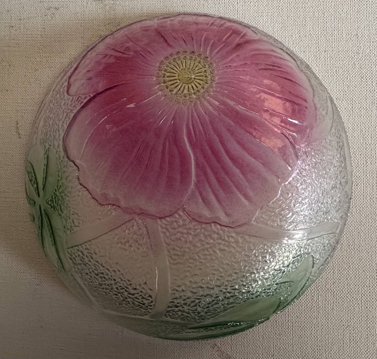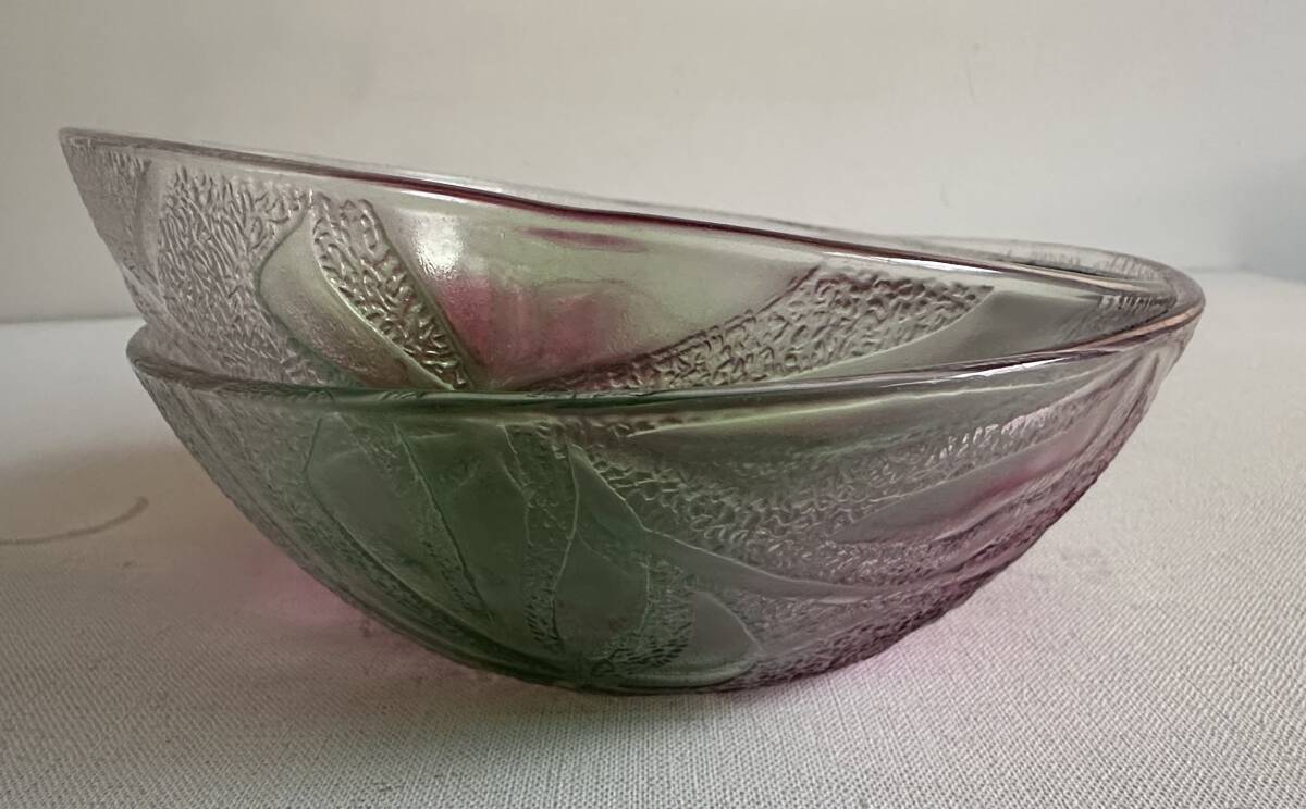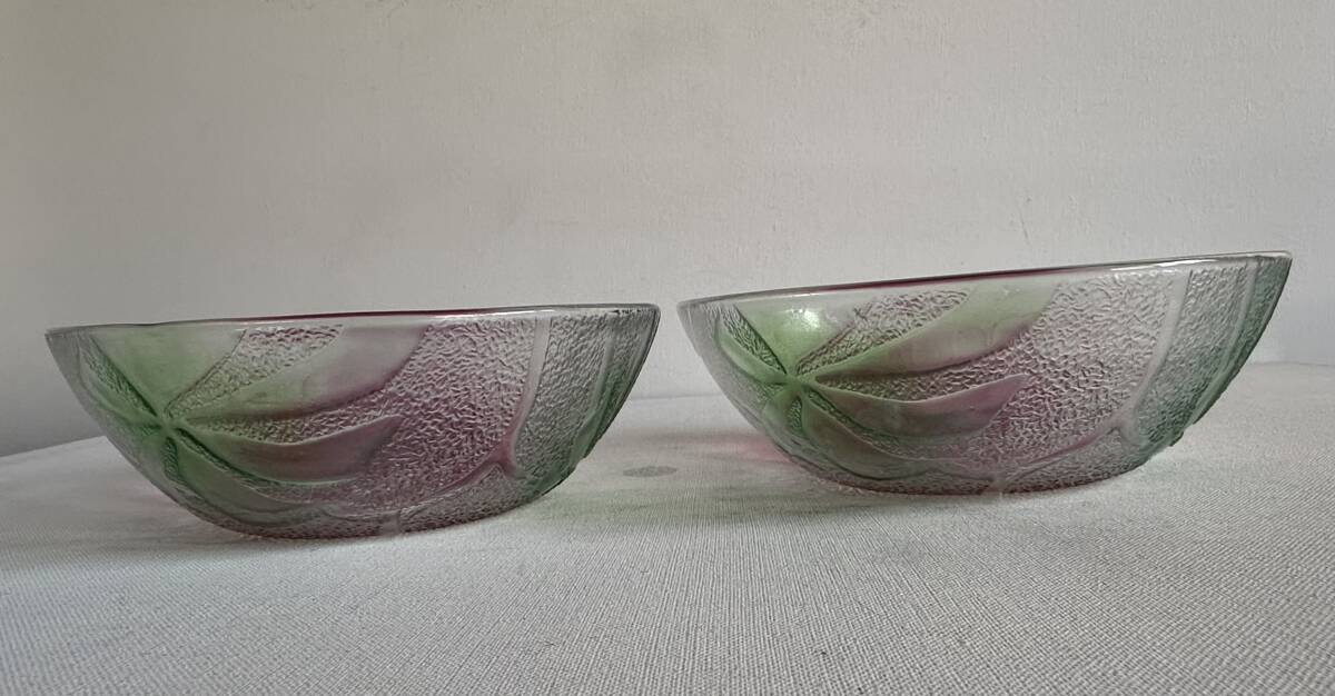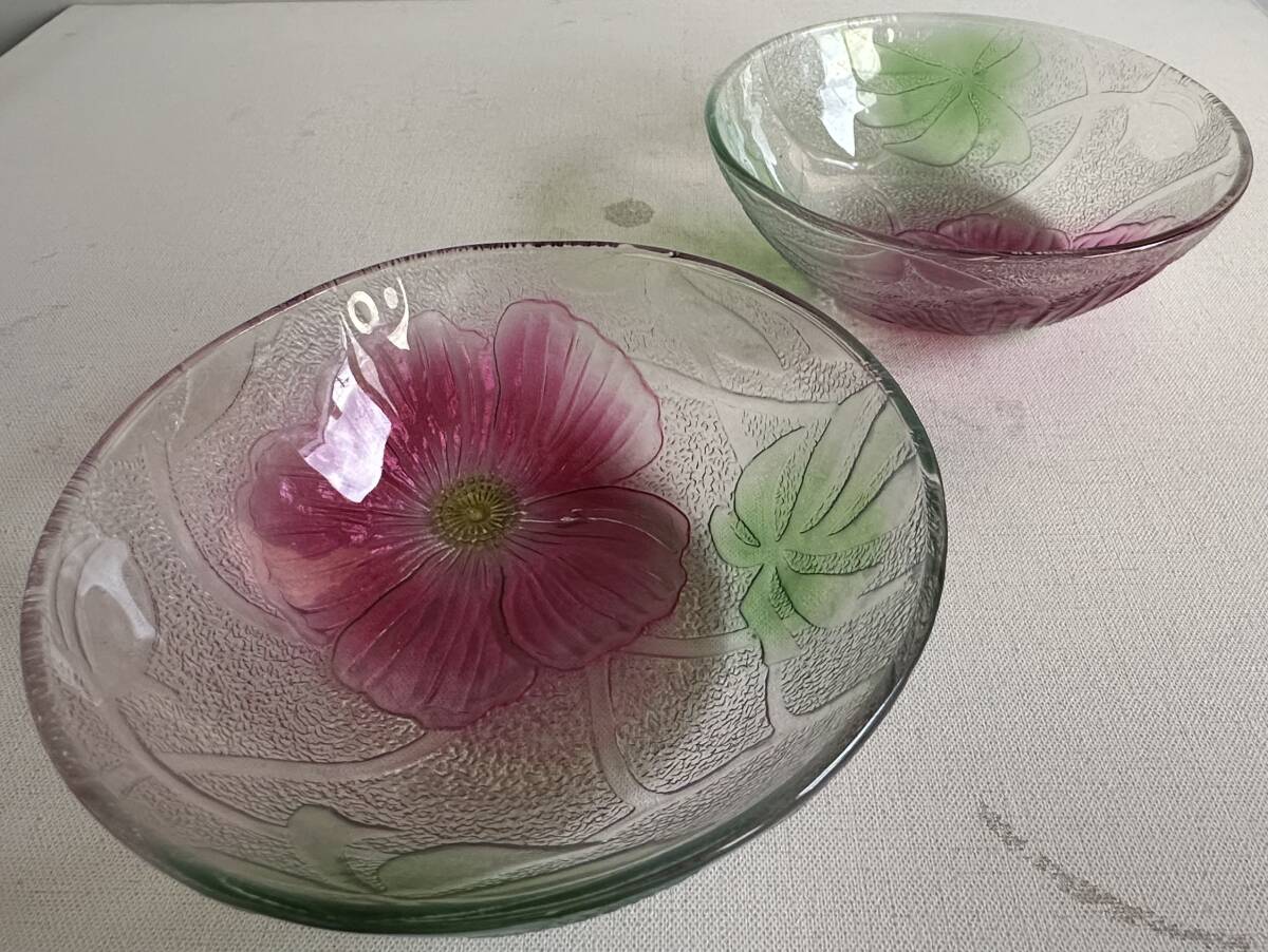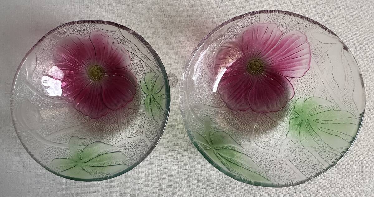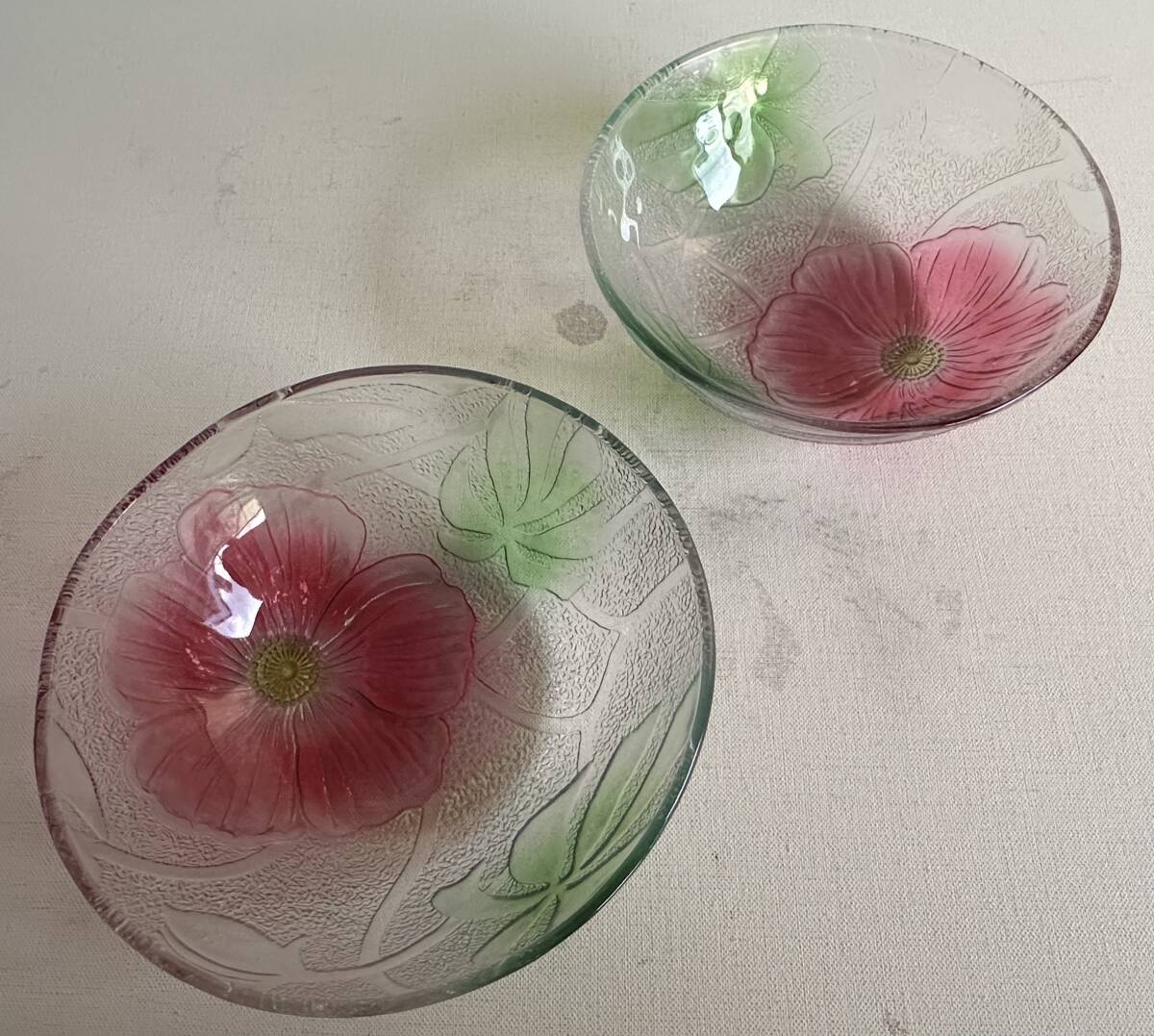 涼しげな紅花モチーフのガラスボウル・器2客組み美品です。サイズ:全高5.5cm。直径16.8cm。2客共に際立った様な汚れや傷等のダメージは有りません。ご理解頂ける方のみノークレーム・ノーリターンでお願いします。