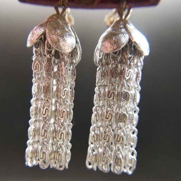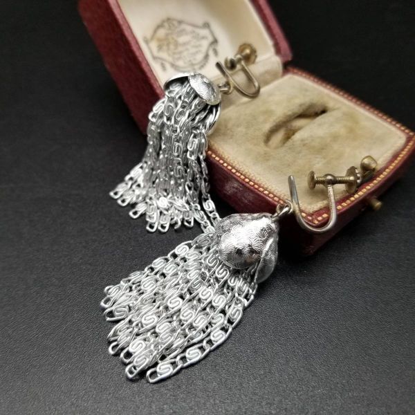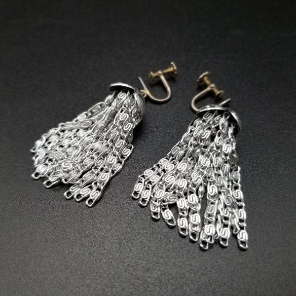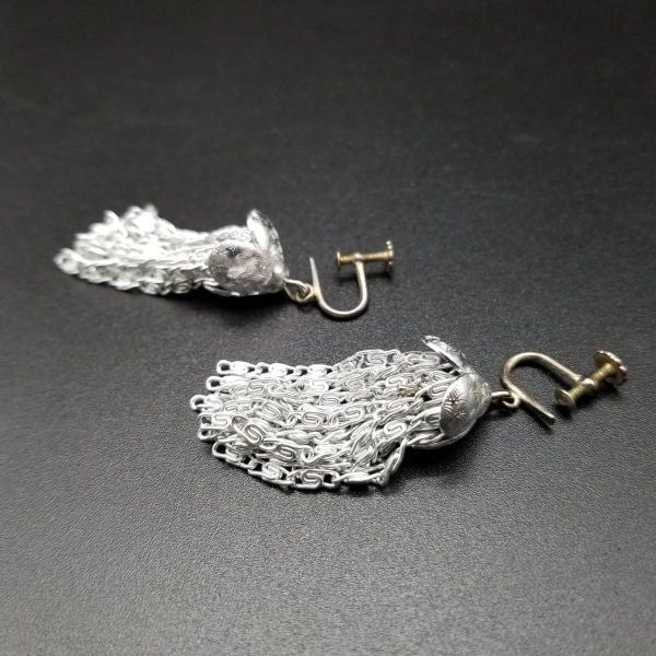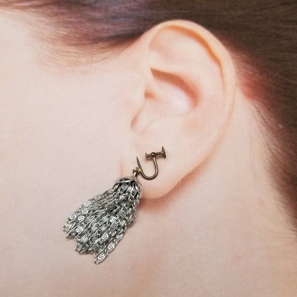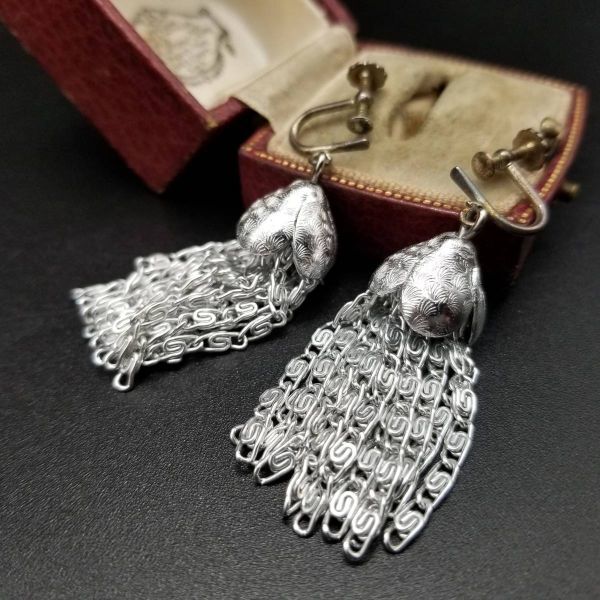 タッセル 渦巻チェーン 存在感 米国 ビンテージ イヤリング シルバートーン アールデコ 昭和レトロ コスチュームジュエリー YS92133