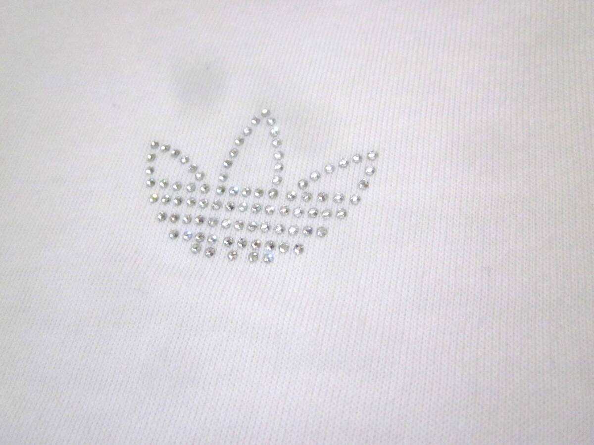 ・色 オフホワイト。オレンジっぽいピンクライン。トレフォイルロゴマーク(スワロ粒のような飾り)。