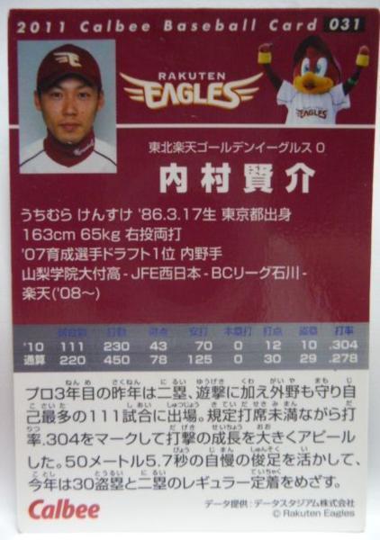 カルビープロ野球カード2011年#031【内村 賢介(東北 楽天ゴールデン イーグルス)】平成23年チップスおまけ食玩トレーディングカード 中古