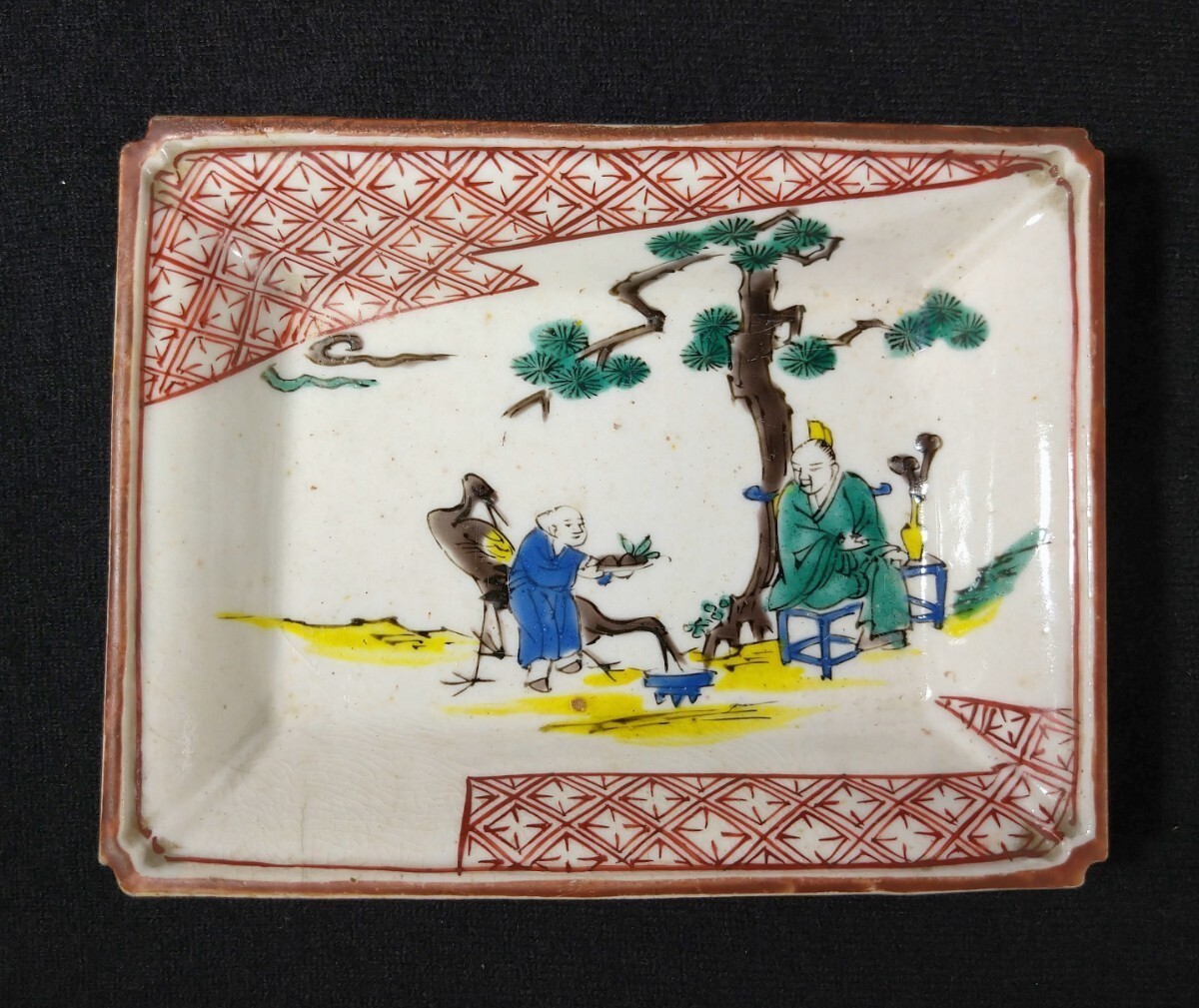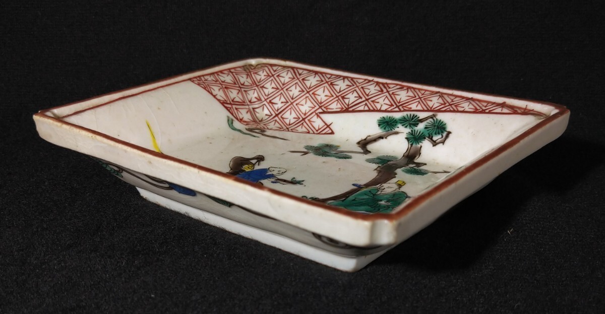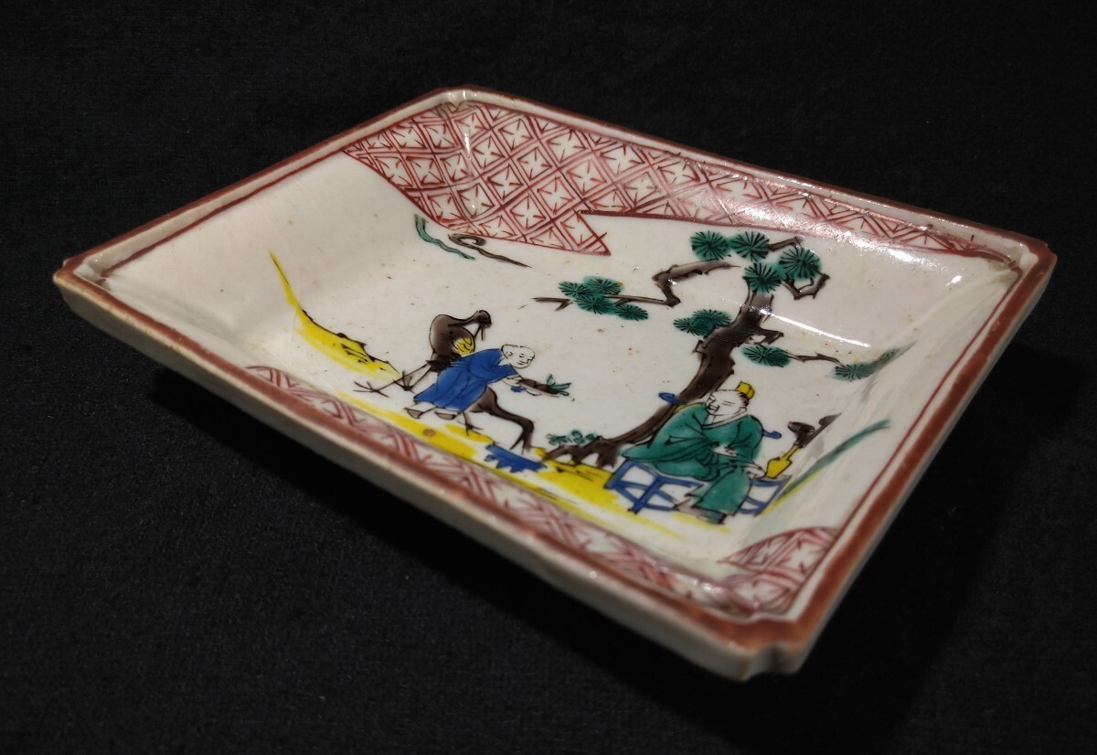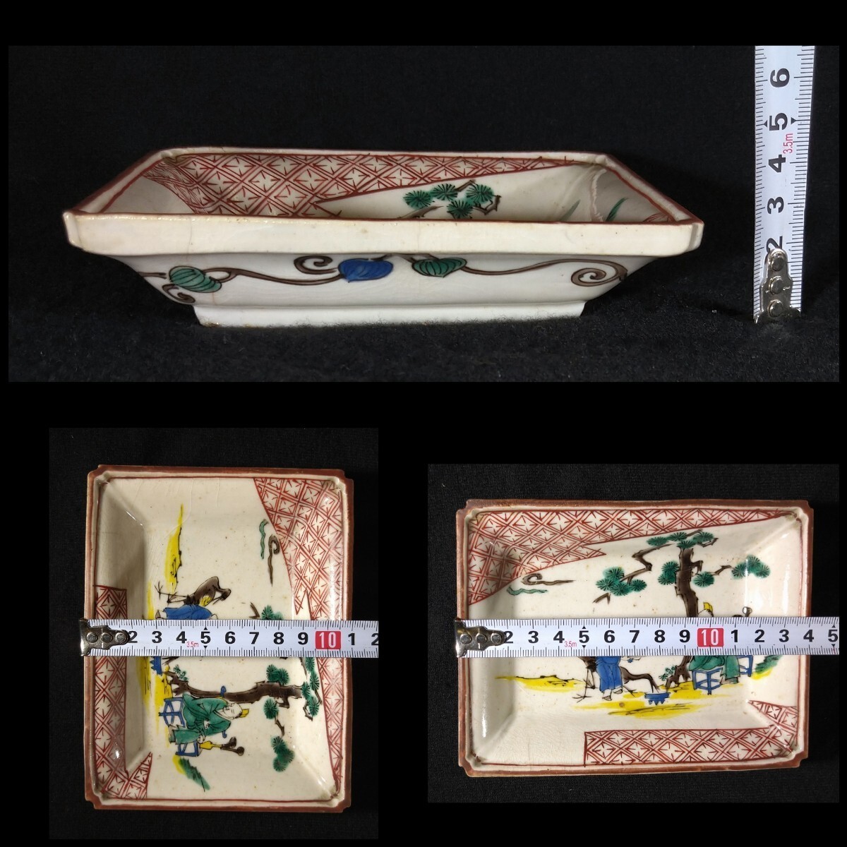 松に人物が描かれた美しい長皿でございます。細かいニュウがございます。素人採寸で申し訳ございませんが、長さ14.4cm、11.1cm、高さ3.3cmでございます。