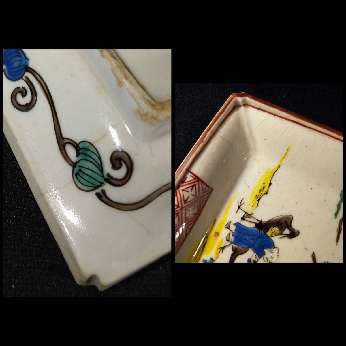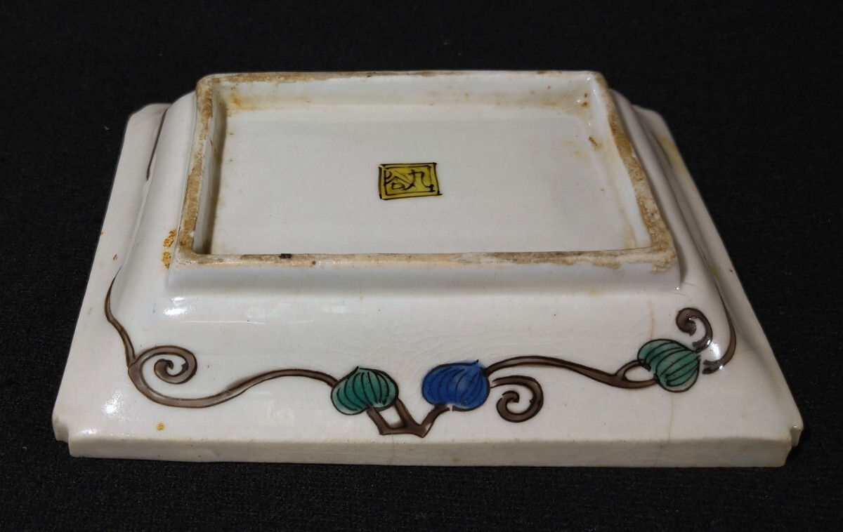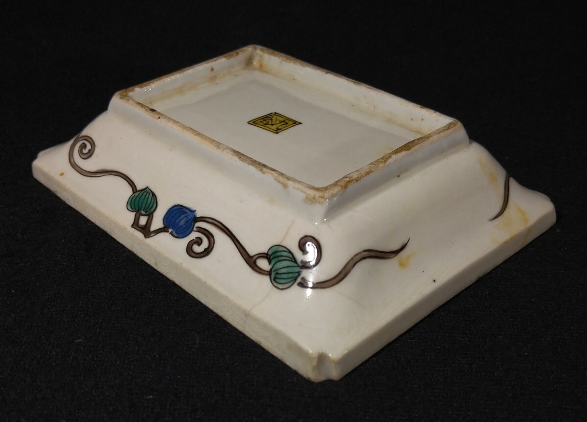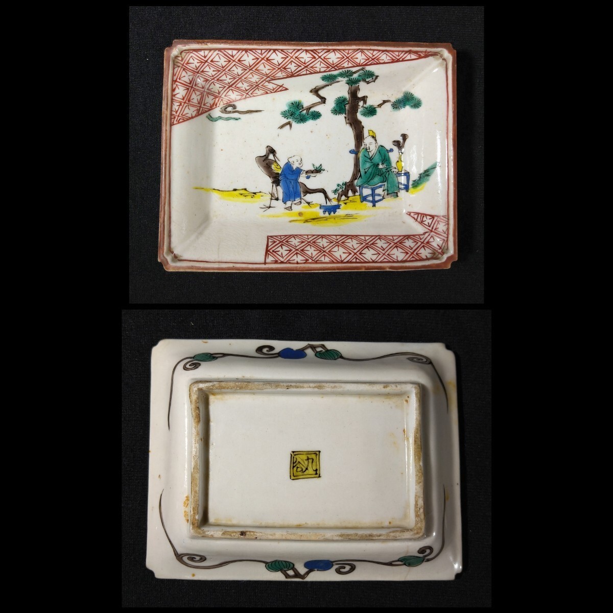 松に人物が描かれた美しい長皿でございます。細かいニュウがございます。素人採寸で申し訳ございませんが、長さ14.4cm、11.1cm、高さ3.3cmでございます。