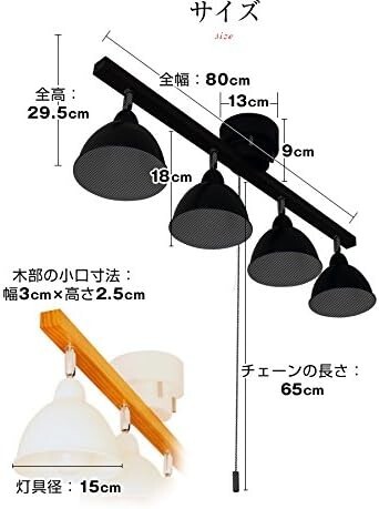 • サイズ:幅80cm×奥行15cm×高さ29cm 適応畳数:6畳・8畳・10畳 重量:1.8kg 材質 スチール/ウッド 4灯(全灯、内2灯、外2灯、消灯)プルスイッチ 使用電球:口金E26 LED昼白色付属