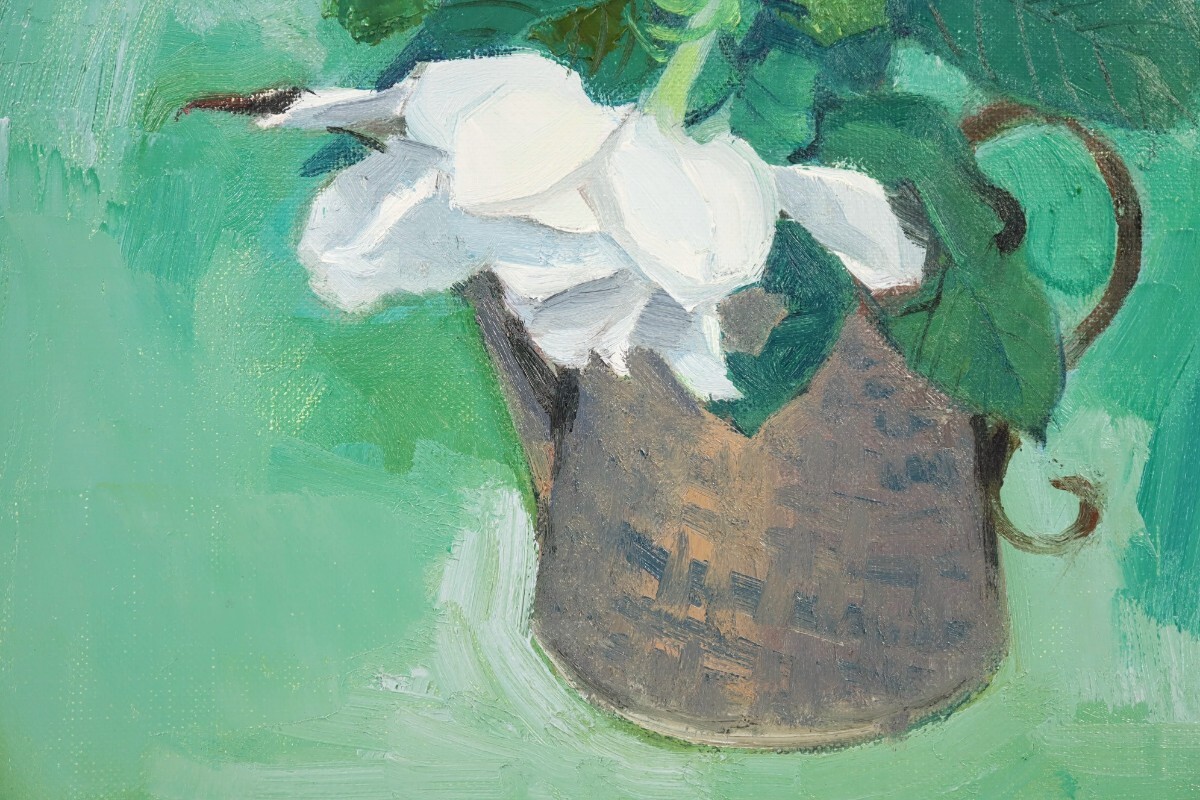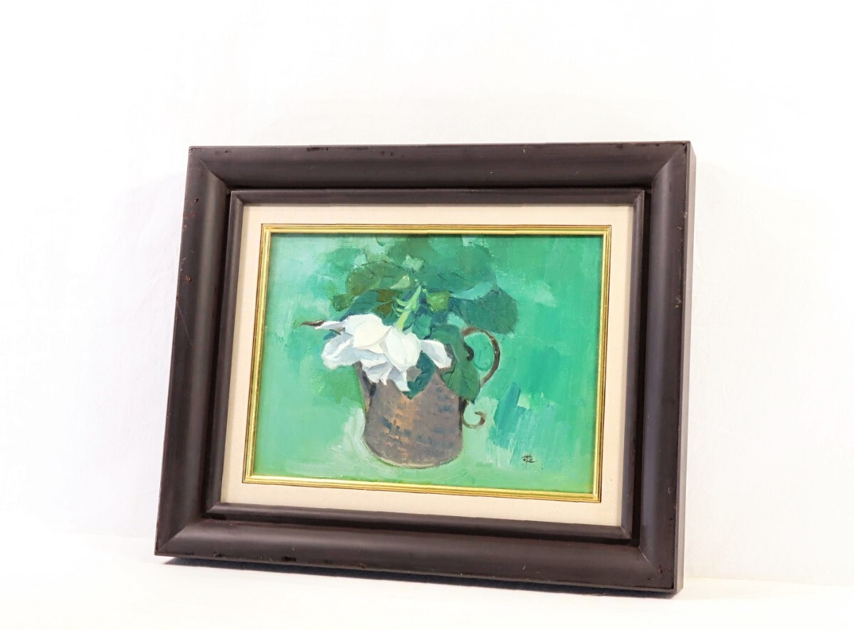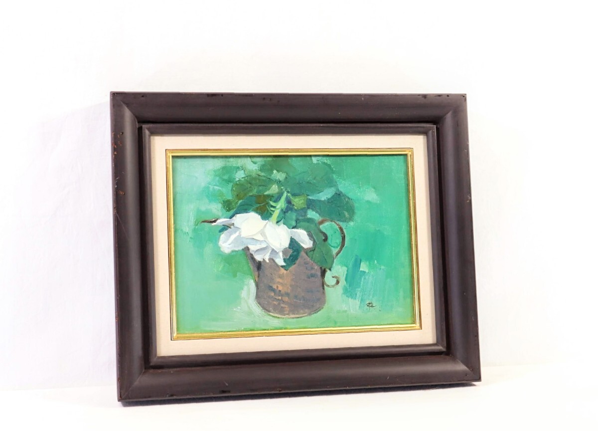 真作 亀尾従道 油彩「緑の風に」画 F4 京都府出身 二科会会員、審査員 伊庭傳次郎、大淵陽一に師事 グリーンの背景に瑞々しく描く白花 8905