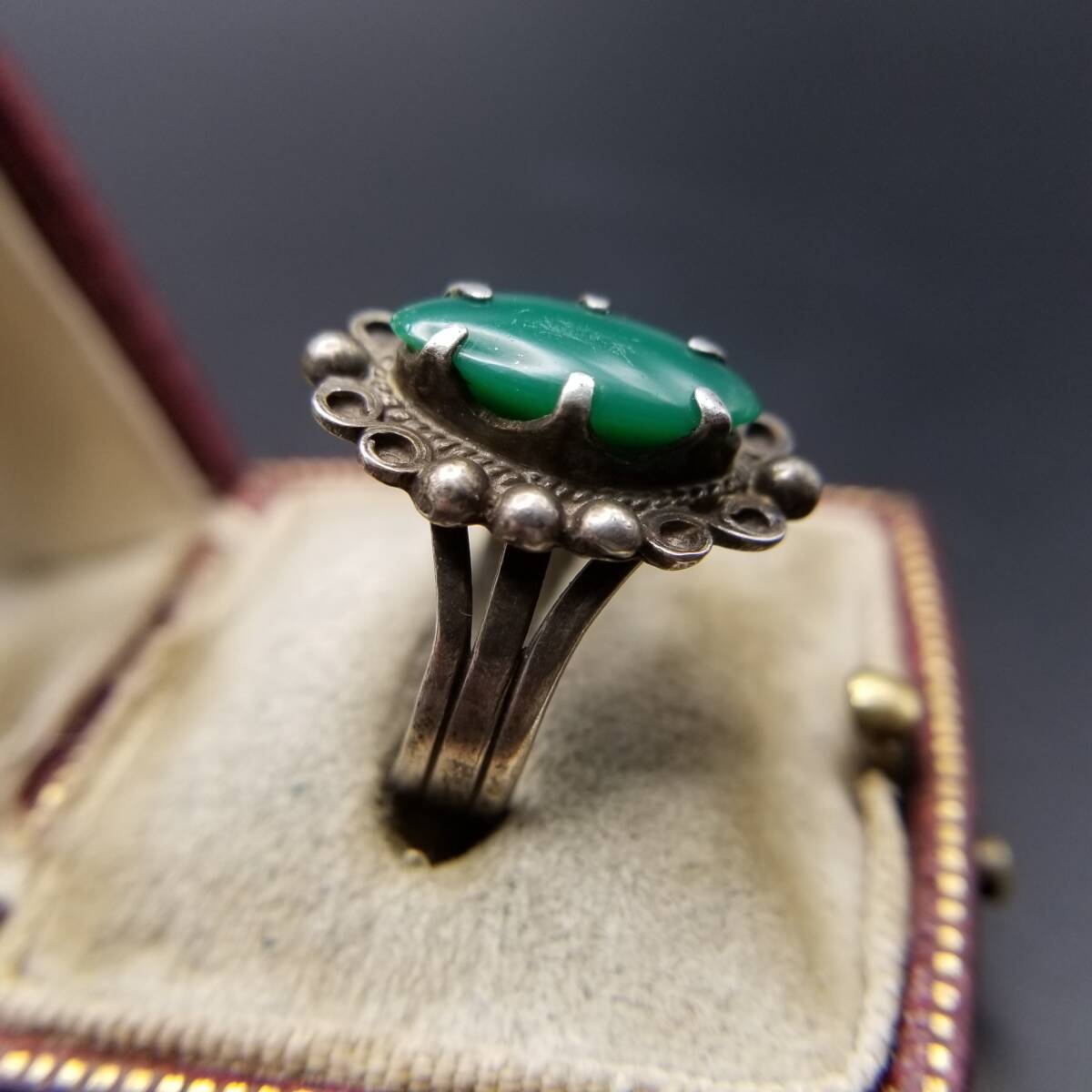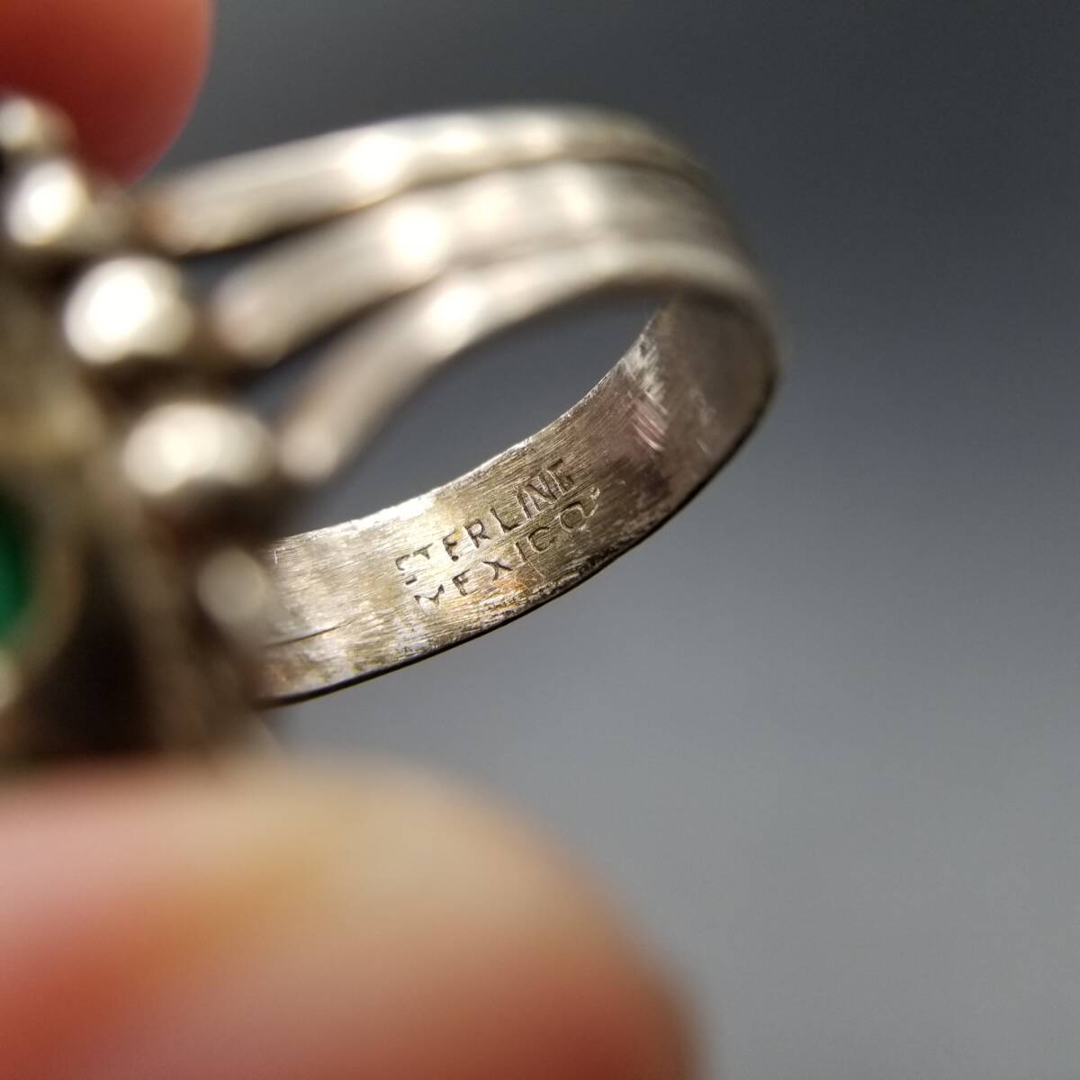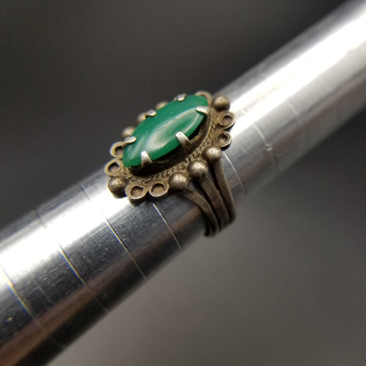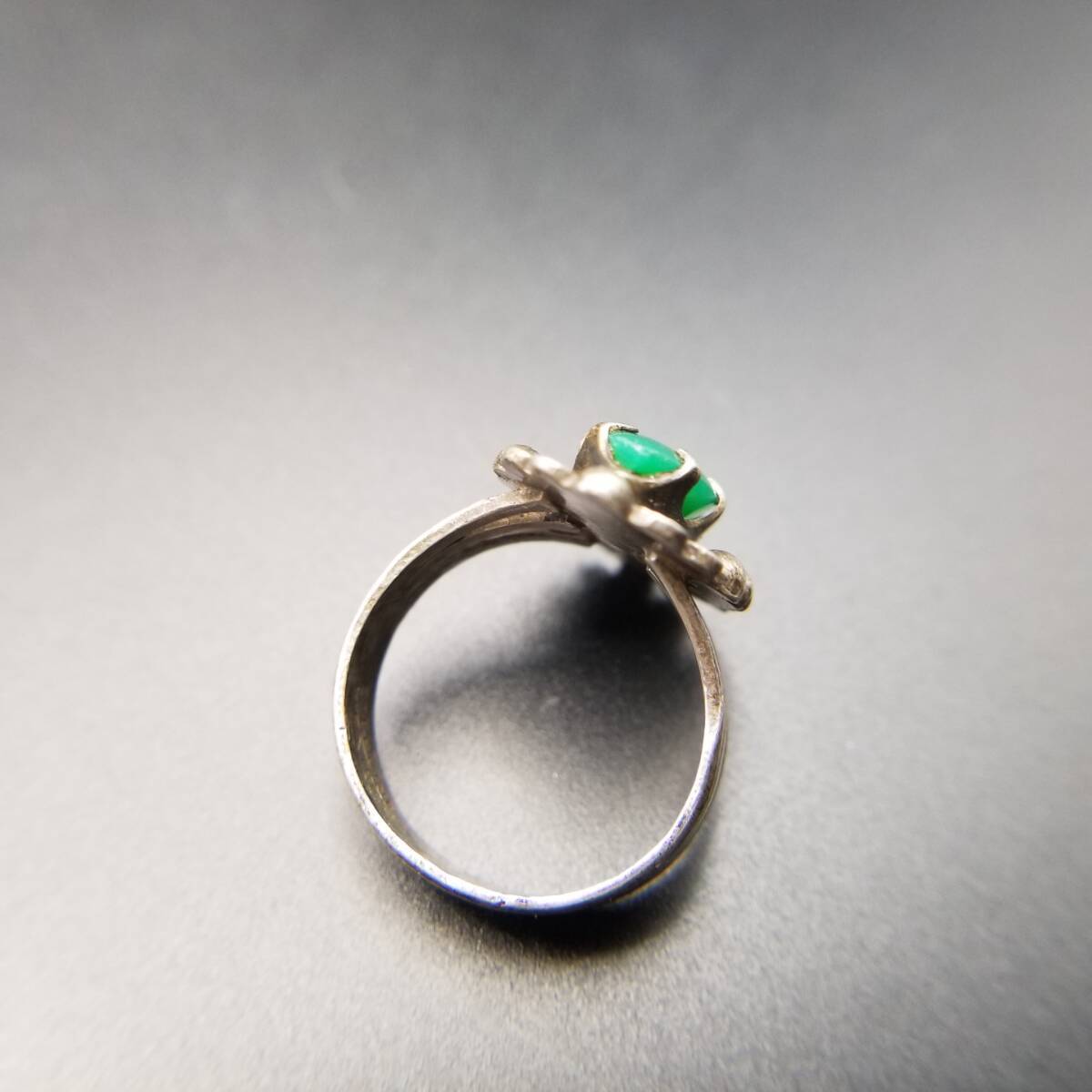 RMM メキシコ 925 シルバー モスグリーン マーキスカット ドットリム ヴィンテージ リング 指輪 銀 フラワーモチーフY15-N