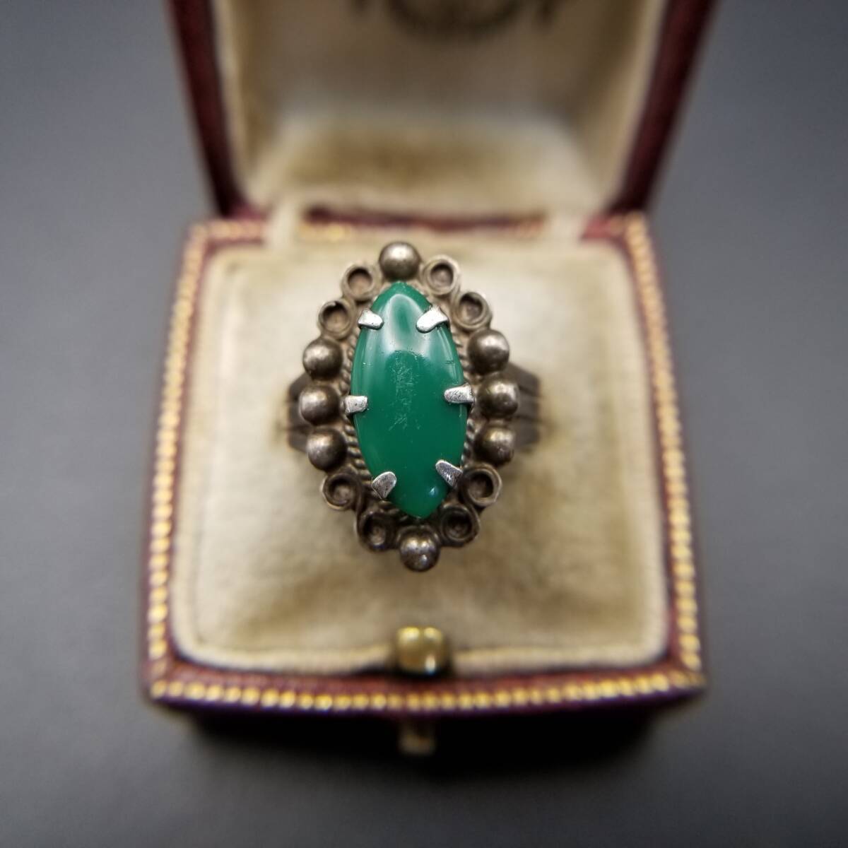 RMM メキシコ 925 シルバー モスグリーン マーキスカット ドットリム ヴィンテージ リング 指輪 銀 フラワーモチーフY15-N