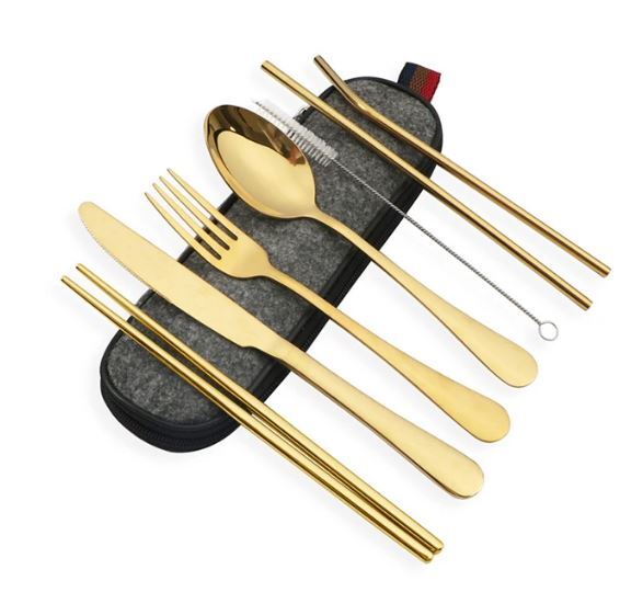 【Gold】8ピース,ステンレス製のトラベル用品セット,キャンプスプーンフォーク,箸とストロー付き,ポータブルカトラリーセット