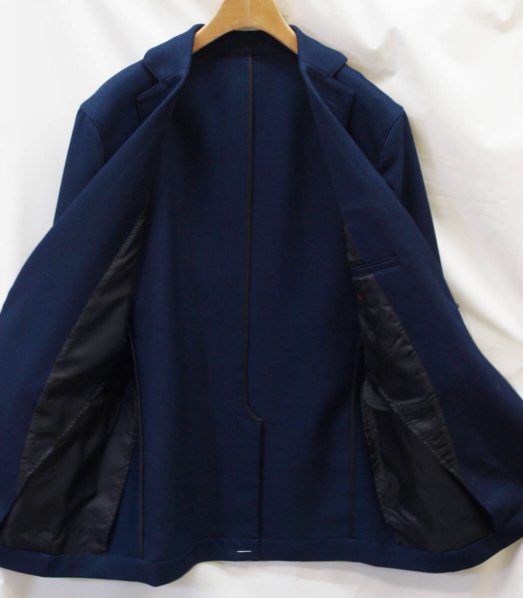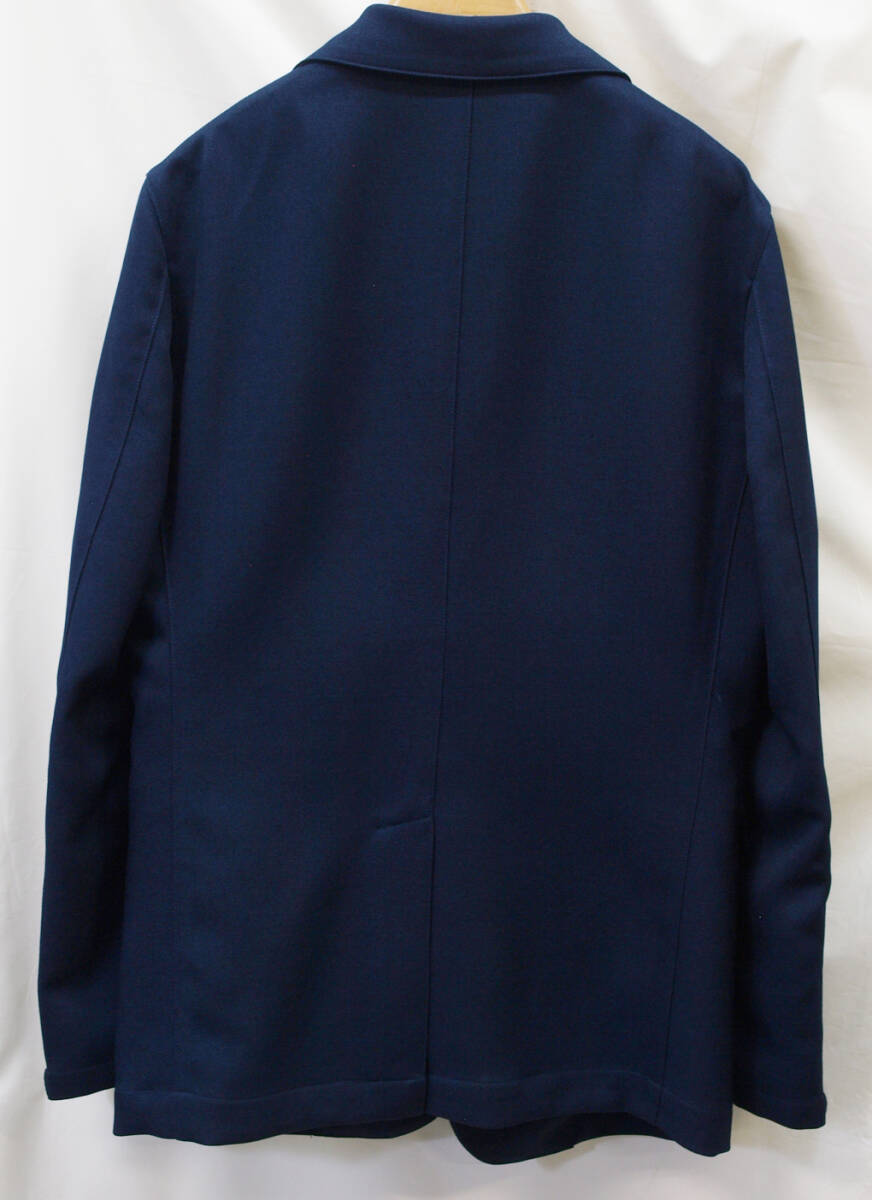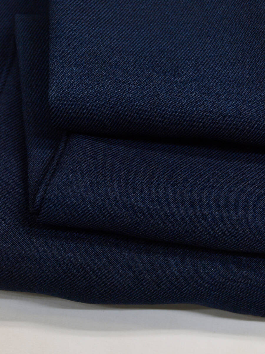 【サイズ】 LL (A7号サイズ相当) 目安の体型 身長175cm~185cm、ウエストサイズ86cm前後 【ジャケット実寸】 肩幅46cm 着丈73cm 袖丈63.5cm 脇下部分53cm 身幅48cm 【パンツ実寸】 最小86cm~最大96cm (ウエスト両脇にゴムシャーリング) わたり幅34.5cm(股下10cmの部位で31cm) 裾幅18.7cm 脇股上27cm 前股上29.5cm 股下74.5cm(三つ折り始末で裾上げ済の状態/新品) 【素材】 表地:ポリエステル100% 裏地:ポリエステル100% 裏地:前身裏/有り 背裏/なし 袖裏/なし 透け感がなくやや厚みがある綾織ポリエステル生地を使用。 【色】 紺色 【柄】 無地 【デザイン】 コンパクトな印象のすっきりとしたシルエット、スリムタイプ新品、裾上げしていない状態です。 ・ジャケットはシングル2つボタンでスリムモデル ・パンツは短め丈(74.5cm)で楽々ウエスト、すっきりシルエットノータックパンツ 秋冬春商品です。 【縫製仕様】 ・ジャケット:シングル2つボタン、肩パットなし、ノッチドラペル、袖口ボタン3つ、筒袖、センターベント、内ポケット1つ、背裏なし(秋冬春向け) ・パンツ:ノータック、ウエスト両脇部分ゴムシャーリング、外側にドローストリング(紐付き)、ベルトループ付き、膝裏当てなし、脇ポケット斜め付け、後ろポケット片玉縁で左右ともにボタンなし、フロントはファスナーでボタン仕様