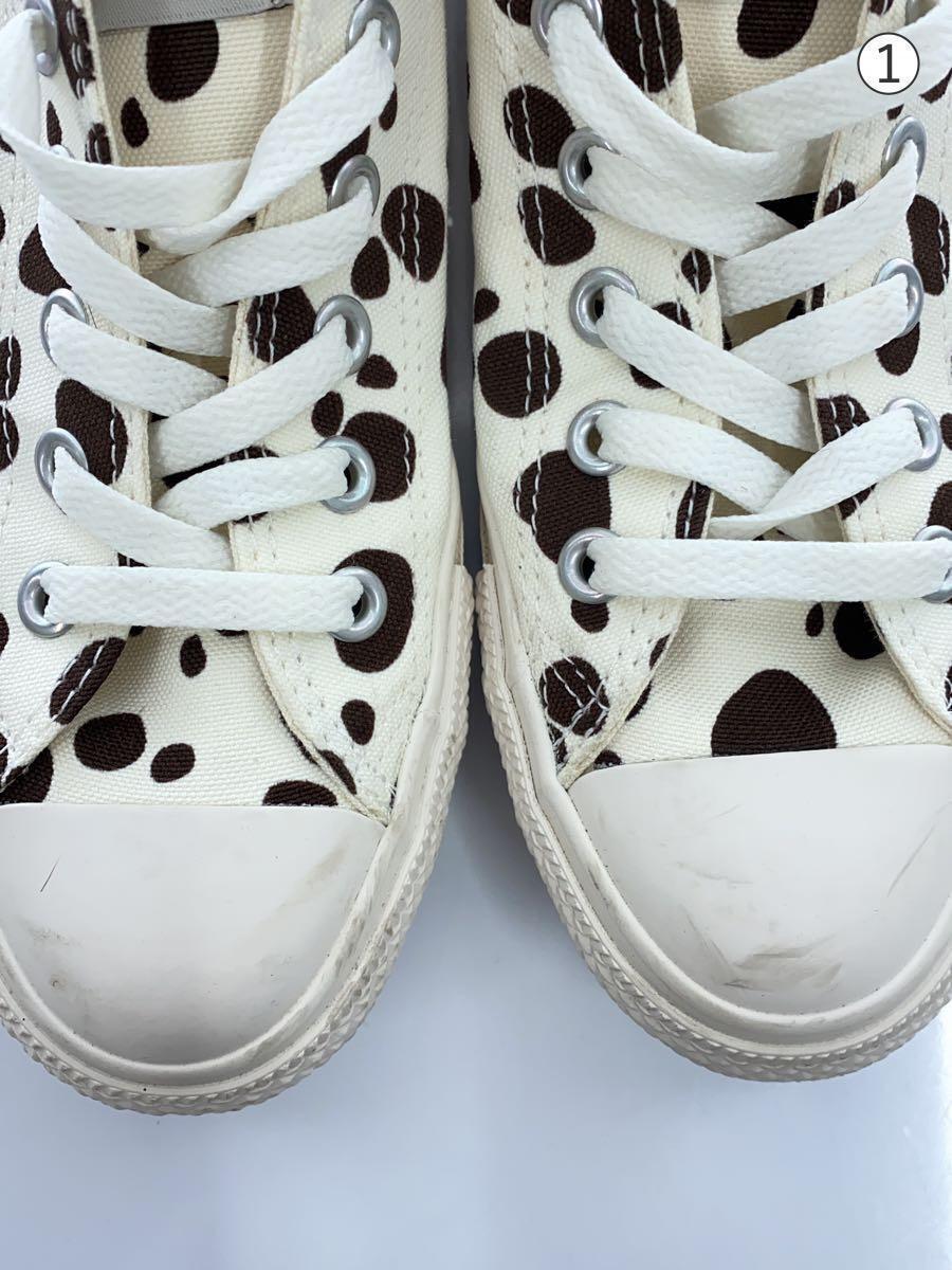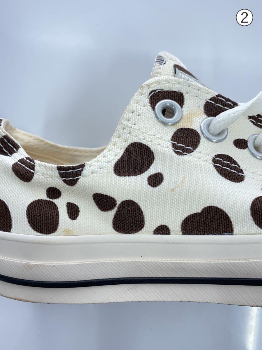 | (1)汚れあり (2)シミあり 右足外側にシミ有つま先部擦れ等ありますがまだまだお使いいただける状態です。 |