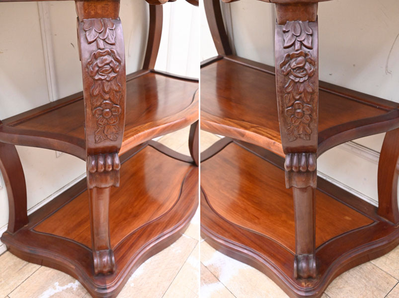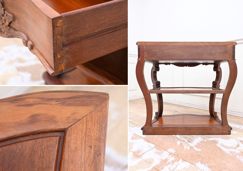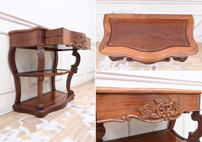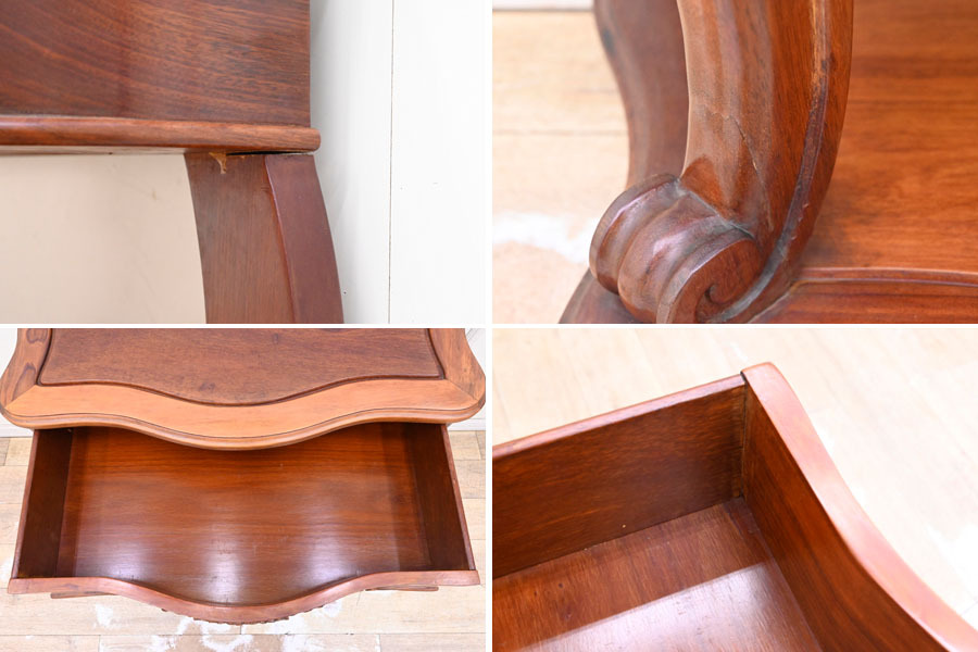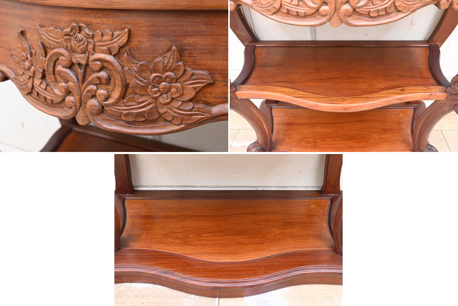 ----------------------------------------------------------------------------------------- ●送料や注意事項は必ずご確認下さい。落札後にトラブルになるケースが増えております。● ◆コンディションは写真・文章にて記載して有りますが、全てのキズの写真は掲載致しておりません。大きなダメージを除き見落とし、記載漏れが有る事はご了承下さい。 ◆当サイトにて出品する商品は多種多彩で、当方商品知識の無い物も多数ありますので落札後の質問やメンテナンス等にはお答えできません。 ◆入札された時点で、画像、文章をご理解していただいたものと判断させていただきます。不明な点は前もってQ&Aからお願い致します。入札後の質問やお電話等でのキャンセルは一切受け付け致しません。 ◆商品説明に「ノークレーム」と記載しているものに関しては、如何なる状況で届いても保証致しません。詳しくは注意事項の「商品到着後について」の最後に記載しておりますのでご確認下さい。 ---------------------------------------------------------------------------------------- 現地伐採禁止となっている花梨を使用したコンソールテーブルの出品です。 硬質で固く、家具には最適な材料である花梨は加工と乾燥が難しく手間暇掛かる物となっています。 また、近年では偽花梨材が多くを占めているので、本物の花梨は希少なお品になります。 今回ご紹介するお品はその、緻密で硬い花梨材に美しい彫刻やカーブを取り入れた、非常に手間暇掛かったお品です。 サイズ 幅85.5 奥42 高79.5cm 【コンディション】 年代の薄汚れ、小キズ、天板各棚多少のキズ、線キズ、向って左前脚一部にヒビ?、支柱と天板の接合部の一部に隙間等有りますが、程度は良いでしょう。多少ガタツキあります。 デザイン的にも珍しいお品ですのでお見逃しの無いように。 | ||