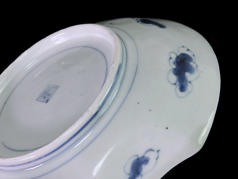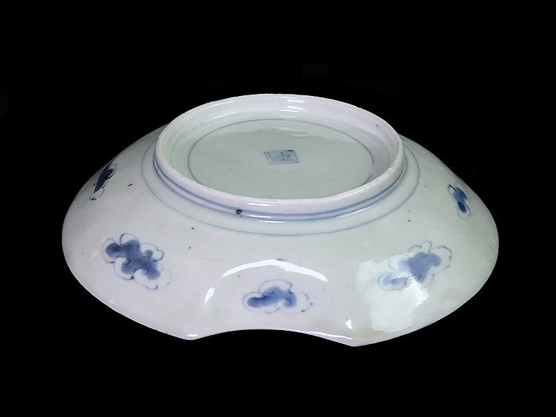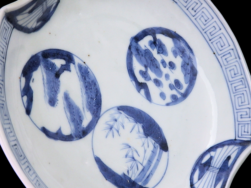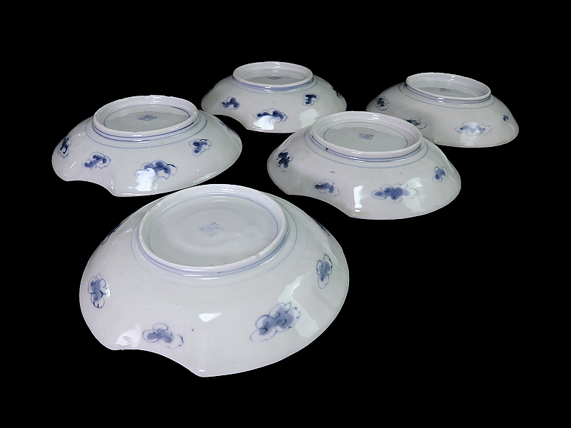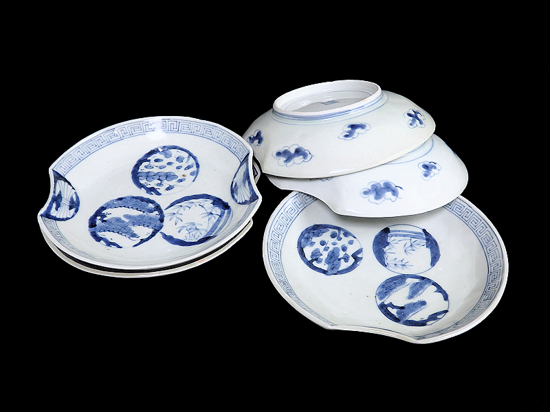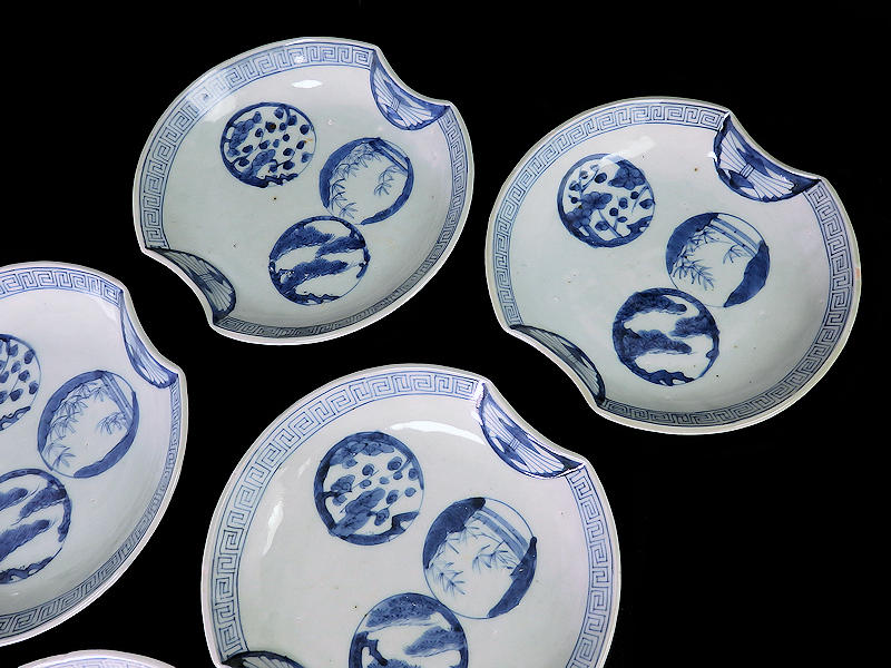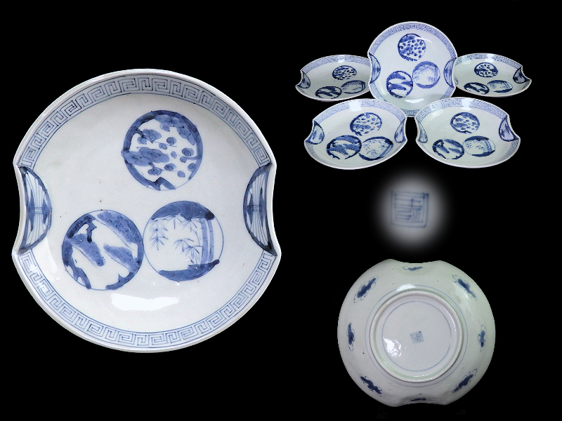★華心★ CQl-E674mS 古伊万里 染付 丸紋に松竹梅の図 分銅型6寸皿 5枚