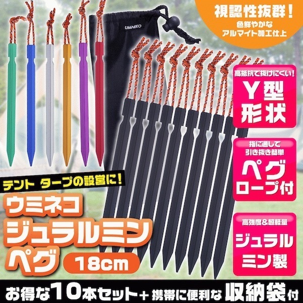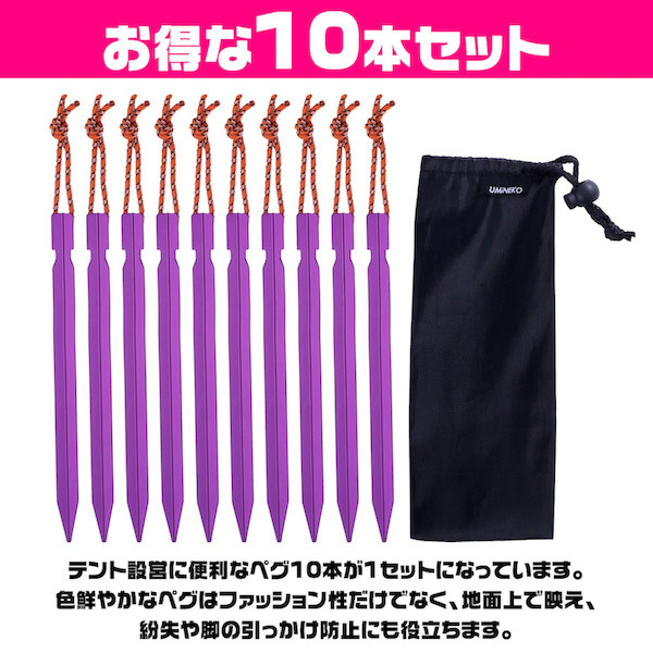 テント設営に便利なペグ10本が1セットになっています。色鮮やかなペグはファッション性だけでなく、地面上で映え、紛失や脚の引っかけ防止にも役立ちます。