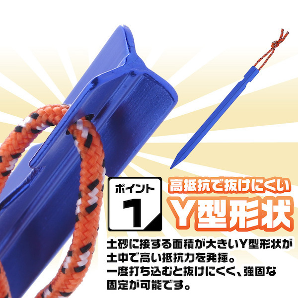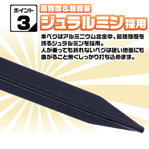 本ペグはアルミニウム合金中、最強強度を誇るジュラルミンを採用。人が乗っても折れないペグは硬い地面にも曲がること無くしっかり打ち込めます。