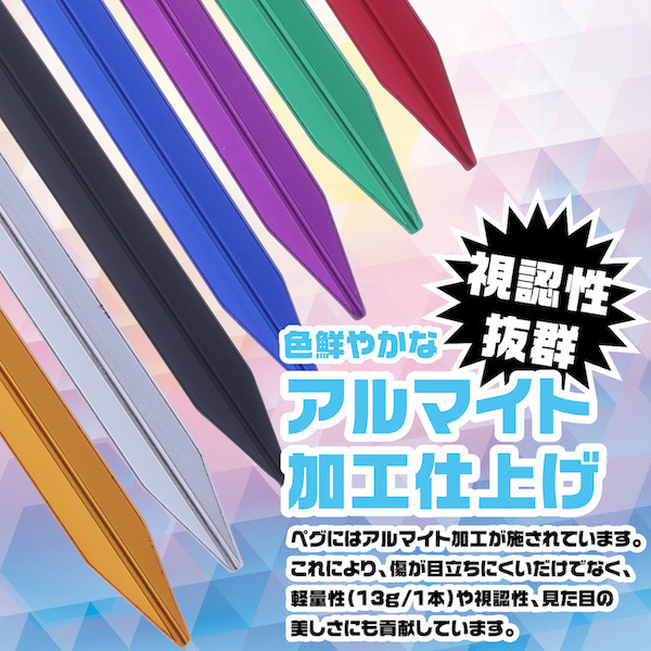 ペグにはアルマイト加工が施されています。これにより、傷が目立ちにくいだけでなく、軽量性(13g/1本)や視認性、見た目の美しさにも貢献しています。