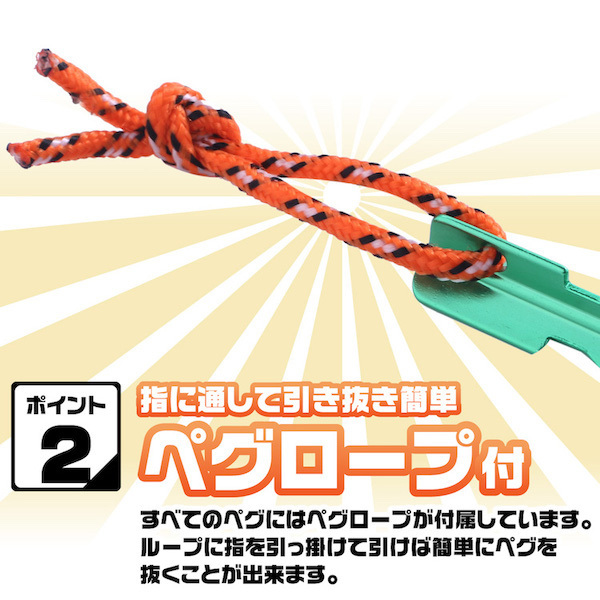 すべてのペグにはペグロープが付属しています。ループに指を引っ掛けて引けば簡単にペグを抜くことが出来ます。