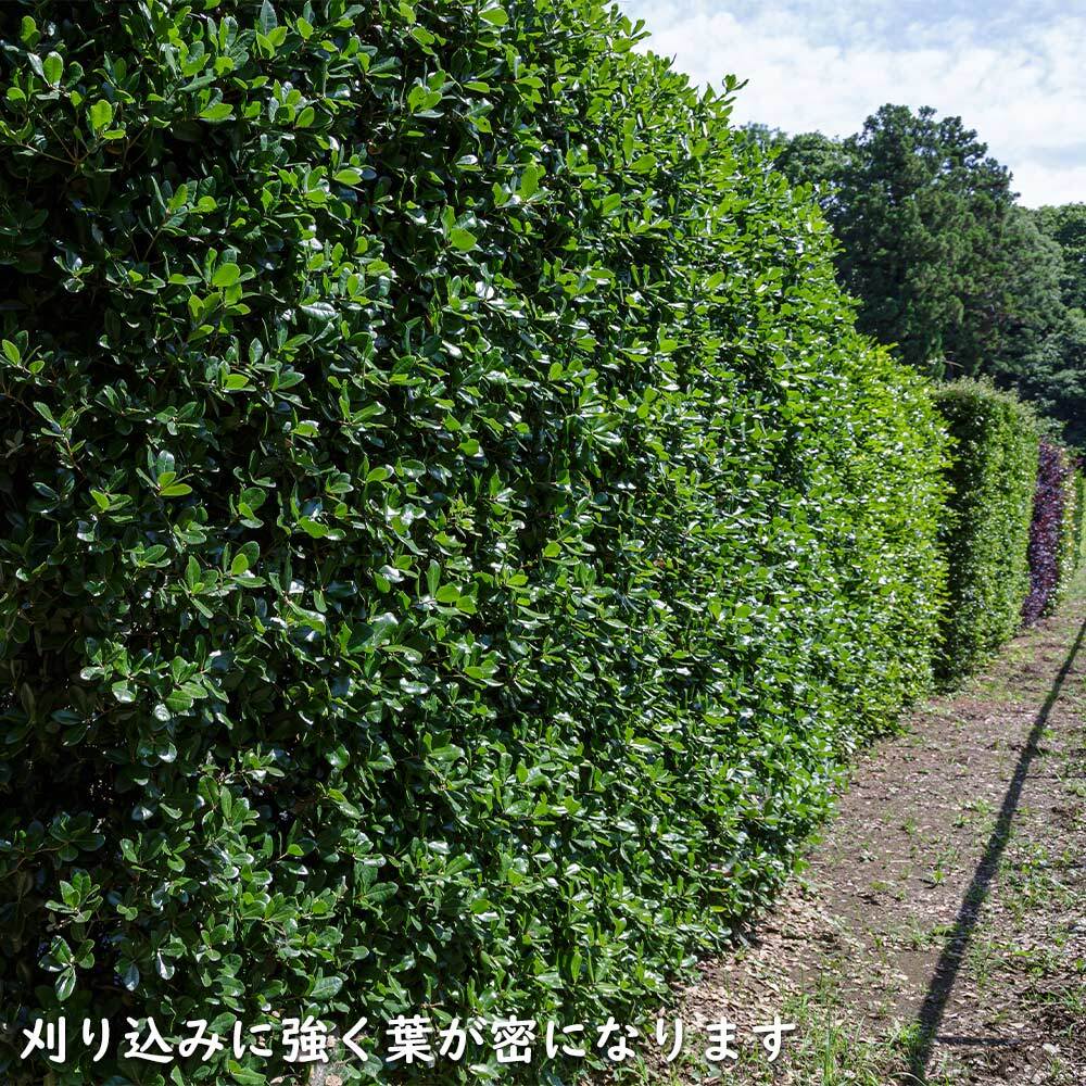 綺麗な緑が特徴で生垣によく使われる樹種です。カシ類ではもっとも強い刈り込みに耐えます。潮風や大気汚染にも強い木です。秋になるとかわいい帽子をかぶったドングリを10月ごろに実らせます。一年中緑色の綺麗な葉が付いています。風に強く防火性も高いために、古来から家を守る為に生垣や防風林に使われたりします。そのまま伸ばすと不整形になります。