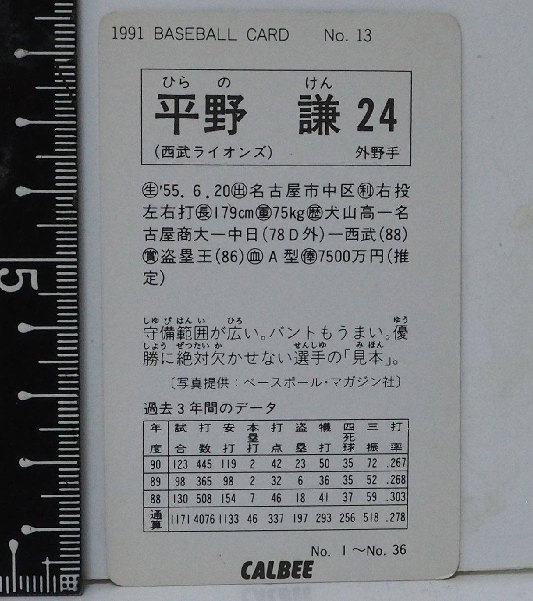 91年 カルビー プロ野球カード No.13【平野 謙 外野手 西武ライオンズ】平成3年 1991年 当時物 Calbeeおまけ食玩BASEBALL【中古】