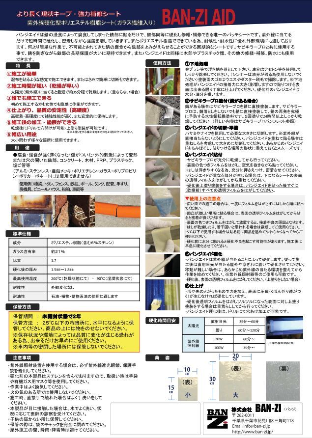 | 1,施工が簡単 湿布を貼るような感覚で簡単に施工できます。必要な量をハサミで簡単に切断してお使いいただけます。 2,施工時間が短い(乾燥が早い) 太陽光(紫外線)に当てると最短で約35分程で乾燥致します。 3,誰でも施工できます 貼り付けるだけなので、初めてご使用頂く方でも簡単に作業が出来ます。 4,仕上がりの良さや品質の安定性が高い 下地への密着も良く・硬度も高く仕上がる為、補強性能が高いです。 また硬化後は安定的にその状態を保持します。 5,施工後の加工・塗装が可能 硬化後にドリルで穴あけ加工も可能。また、上塗りで御好みの御色で仕上げる事も可能です。 6,幅広い用途 ハサミで必要量を調整出来る為、細かい場所に貼るのもよし。 巻き付けるのもよし。様々な箇所に御試用頂けます。 7,コスト削減に貢献可能 施工に必要な道具が不要の為、本品以外にコストは発生致しません。 8,食品衛生法適合の高い安全性 本品は食品衛生法に適合(おもちゃの製造基準準用)の 高い安全性を有したシートとなります。 | ||||||||||||||||||