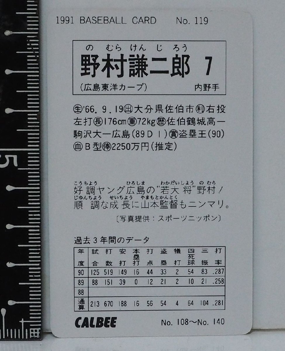 91年 カルビー プロ野球カード No.119【野村 謙二郎 内野手 広島東洋カープ】平成3年 1991年 当時物 Calbeeおまけ食玩BASEBALL【中古】