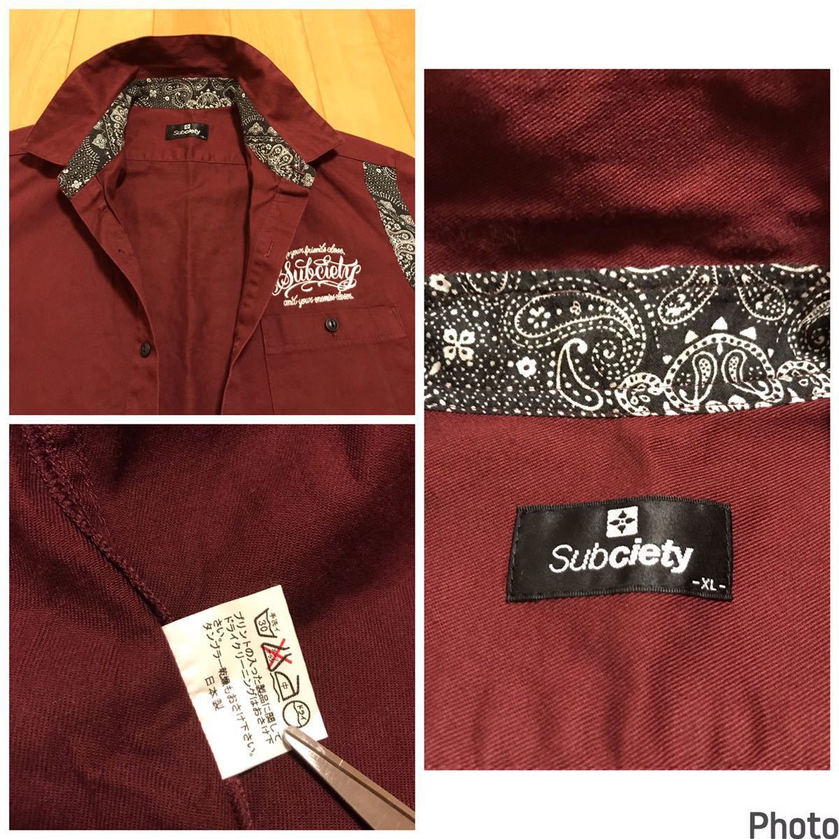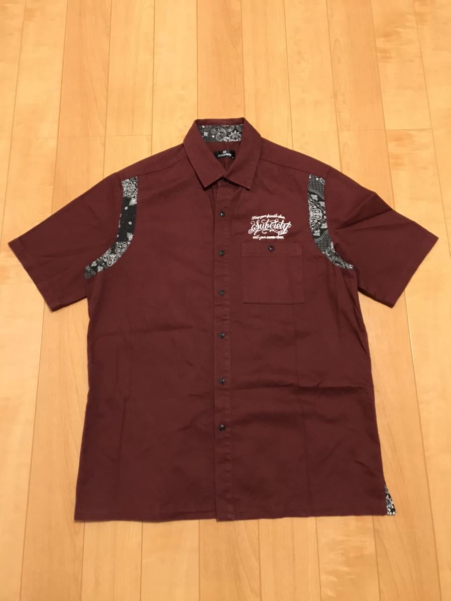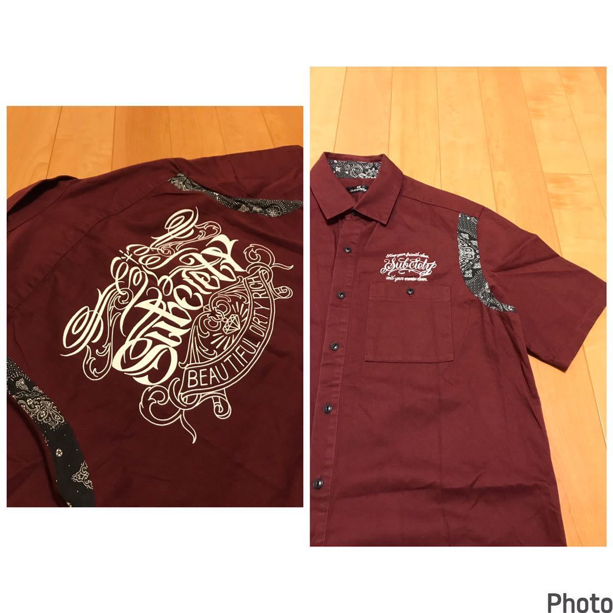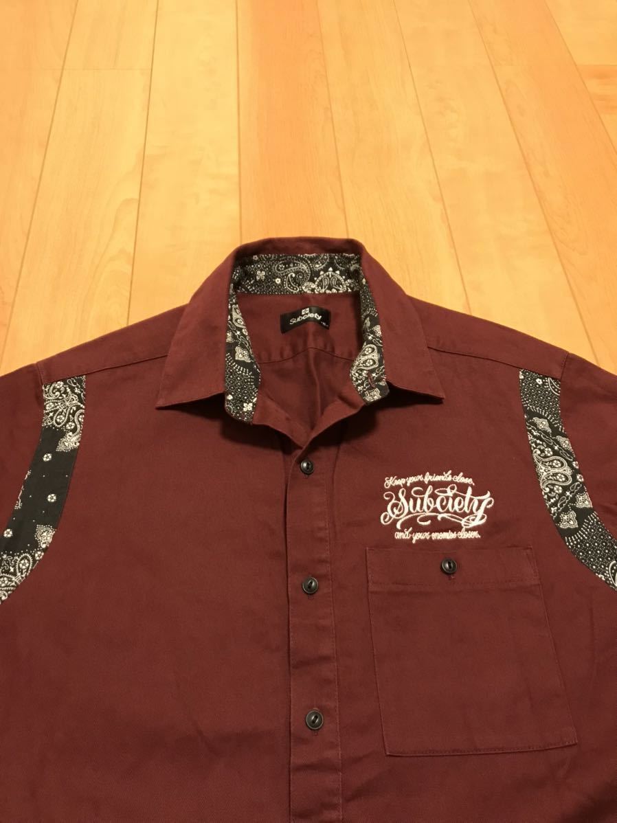 美品☆Subciety/サブサエティ メンズサイズXL 半袖ワーク調.ボーリングシャツ・背面BIGロゴ入&ペイズリー柄切替 猫目ボタン ボルドー色!