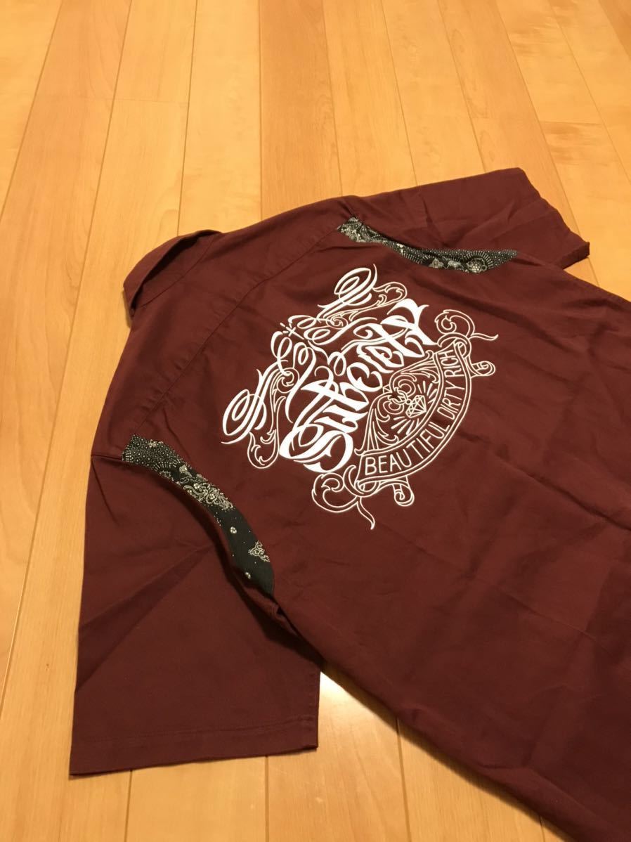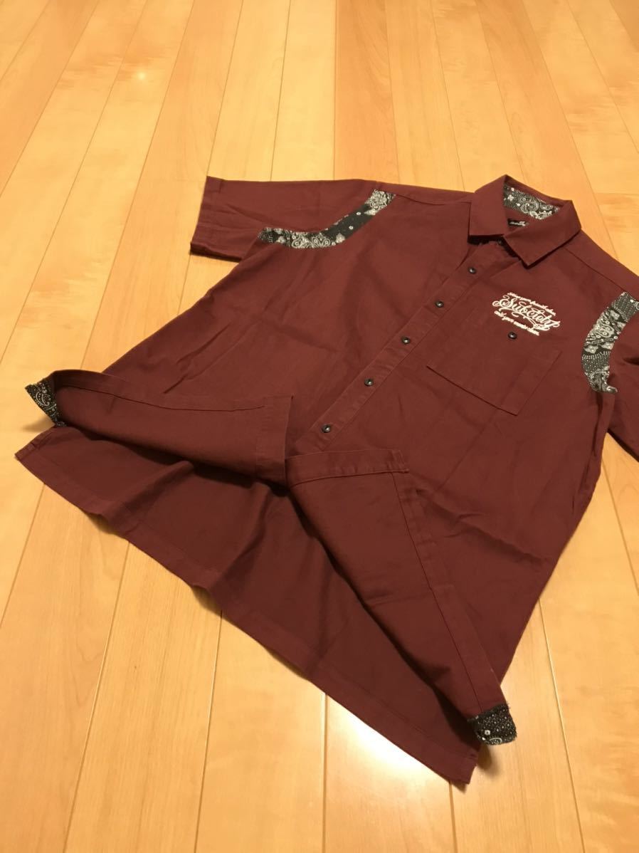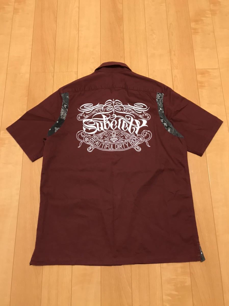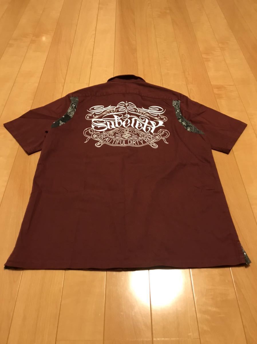 美品☆Subciety/サブサエティ メンズサイズXL 半袖ワーク調.ボーリングシャツ・背面BIGロゴ入&ペイズリー柄切替 猫目ボタン ボルドー色!