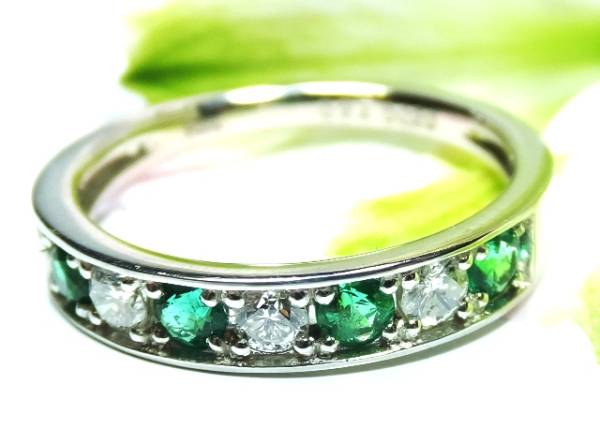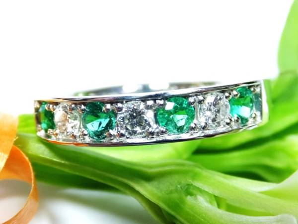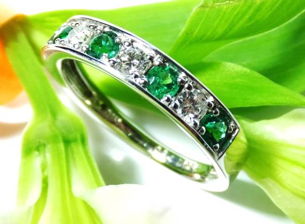 品質の高いエメラルドとダイヤが一列に並んだ エタニティリング