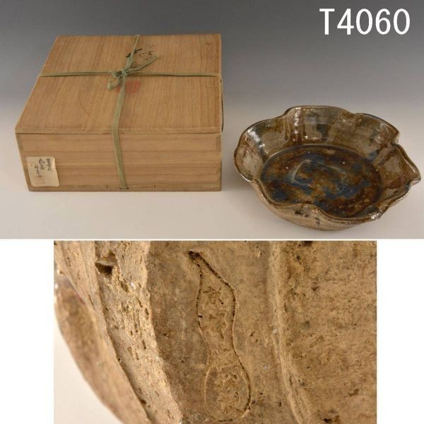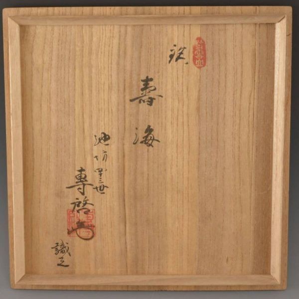 状態:口縁外側に窯割の埋め直し2ヶ所と小さい窯割少々。他、大体良好。胴に掻き銘「壽海 専と家元の花押」あり。畳付に押印「京都 植松製」あり。箱イタミ多々あり。防虫剤入り。