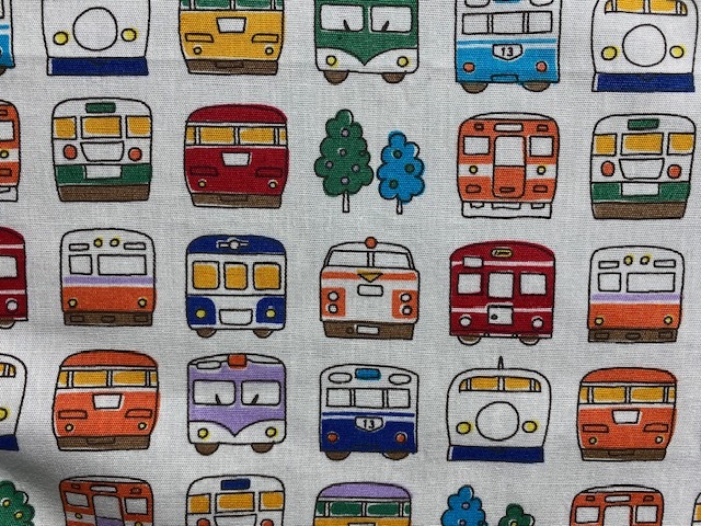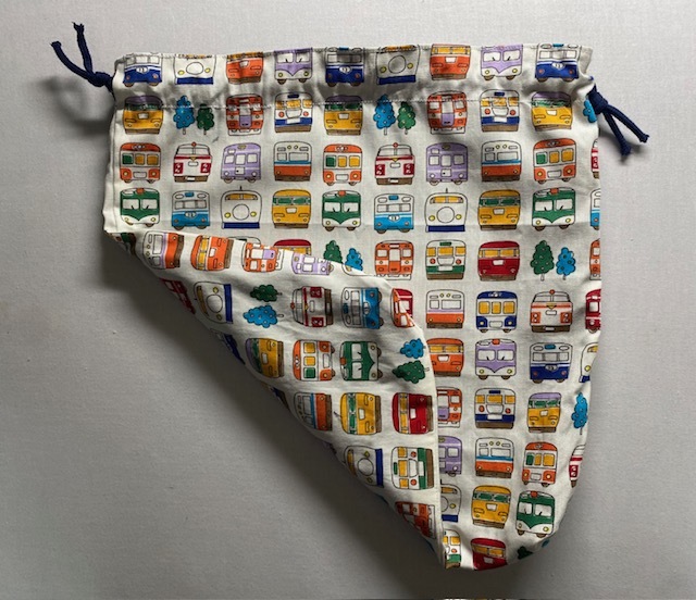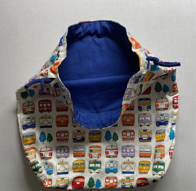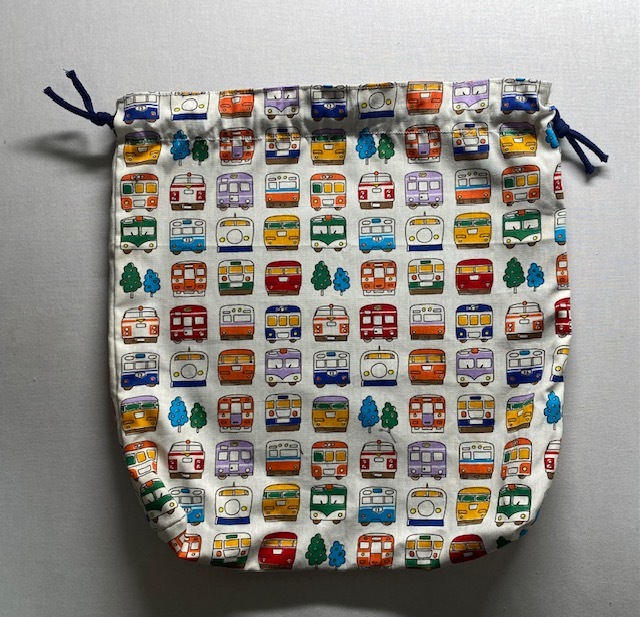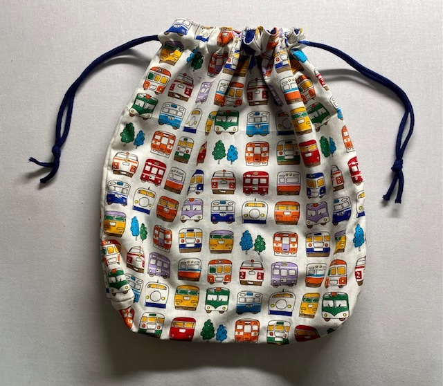かわいい電車柄の生地で作成した、大きめの巾着袋です。
