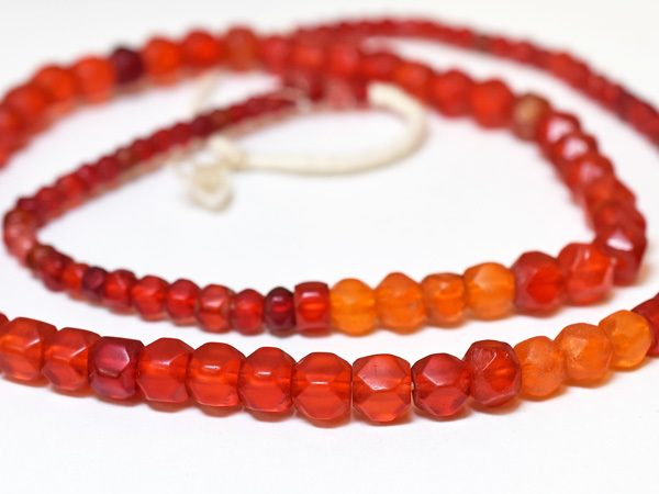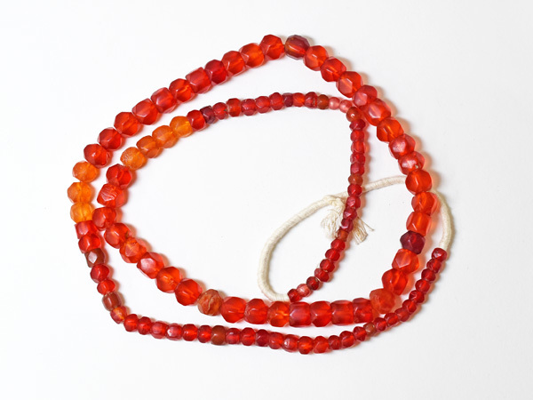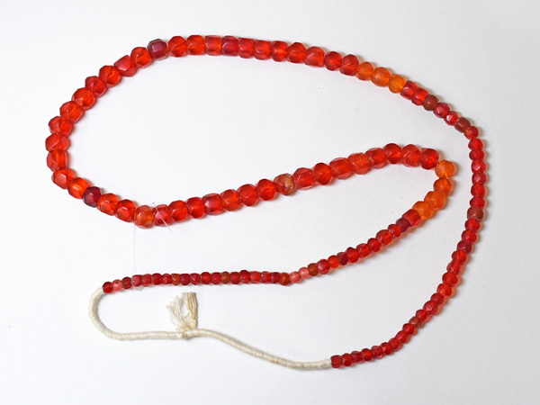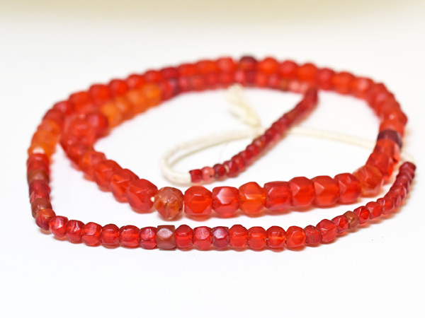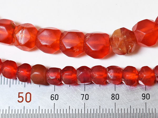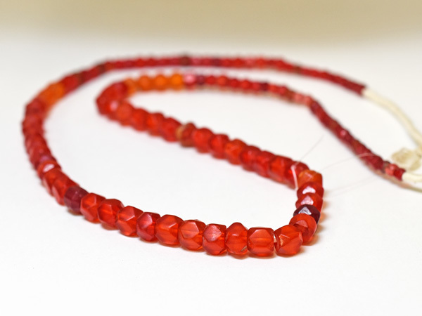 チェコ原産の赤色多面体型のアンティークボヘミアビーズ一連です。西アフリカ地方へ交易品として輸出され、代々、マリのドゴン族に伝わったビーズ一連です。濃淡のある赤半透明で、全ての粒が多面体型です。粒のサイズ、形状、色にはやや個体差があります。状態は概ね良好です。